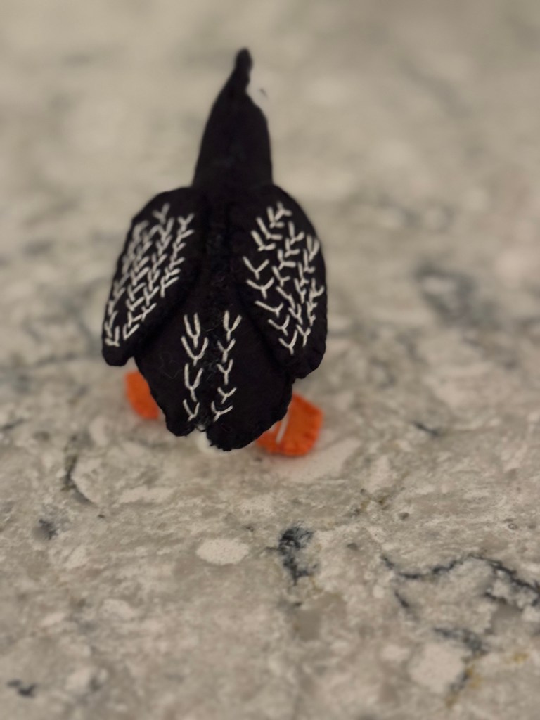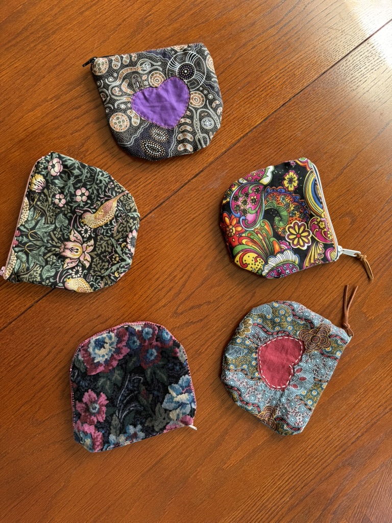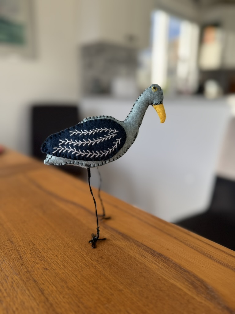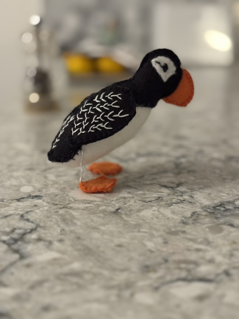 Kathryn’s robinAllison’s pigeonEvan’s heronNancy’s reversible purple apronNancy’s reversible purple apronSarah’s swanI made felt hearts for friends at Christmas.Nat’s puffinNat’s puffinI started a quilt for Lillian’s great grandson, FoxWilson the owl, a gift for Michael Magic bag lined with fake fur for Nat’s 30th birthdayWomen in Need’s Upcycle and Craft store on North Park Avenue. I work there on Thursday afternoons.