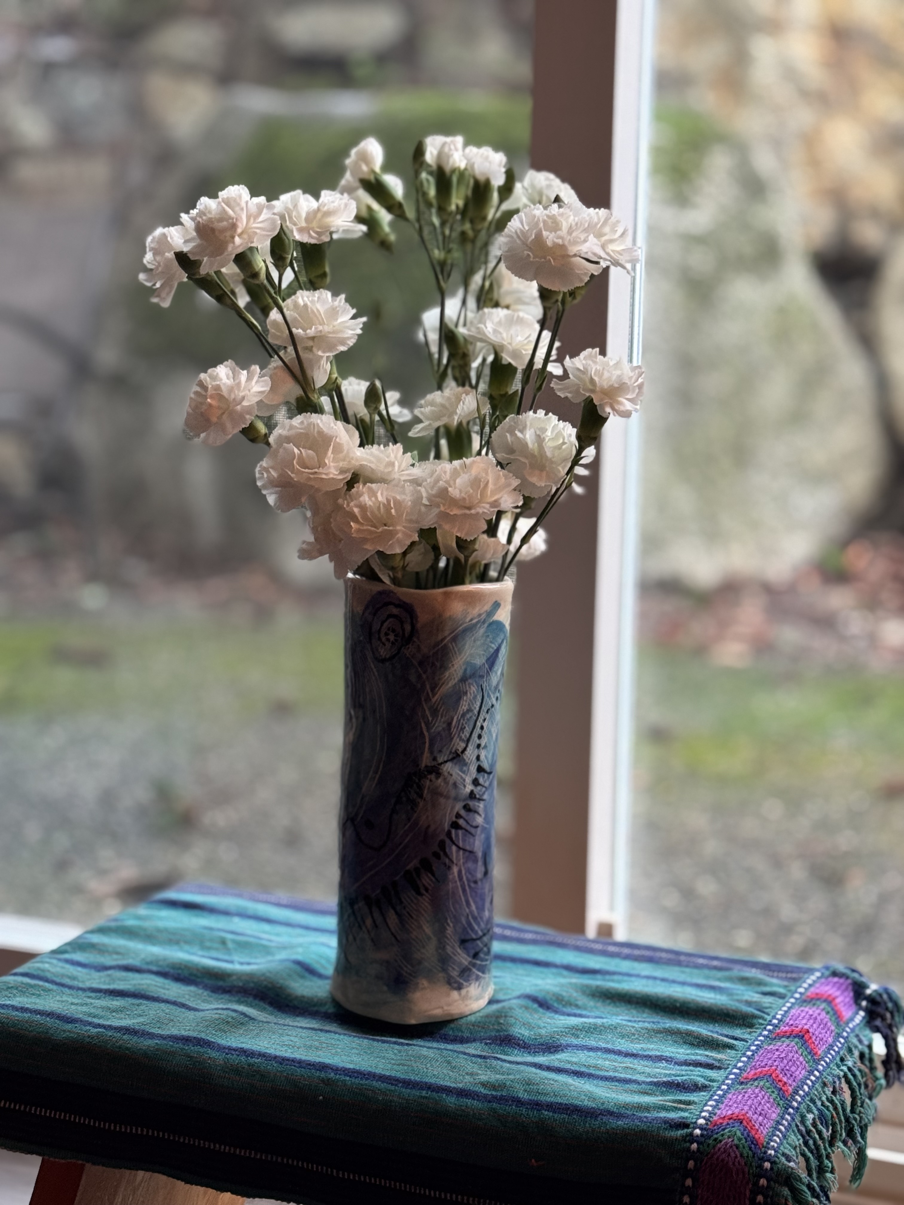 Finally, I used only the eucalyptus, splayed out in a free-fall arrangement. I attached a few small, red shiny balls to the stems, and the effect, I hope, was Christmassy and charming, if a bit messy. Lillian said she loved it. (But what could she say, really?) I was going to throw out the unused carnations, but it seemed such a waste, so I put them in a white and blue vase and placed it in my study on a low stool covered with a blue-green cloth.