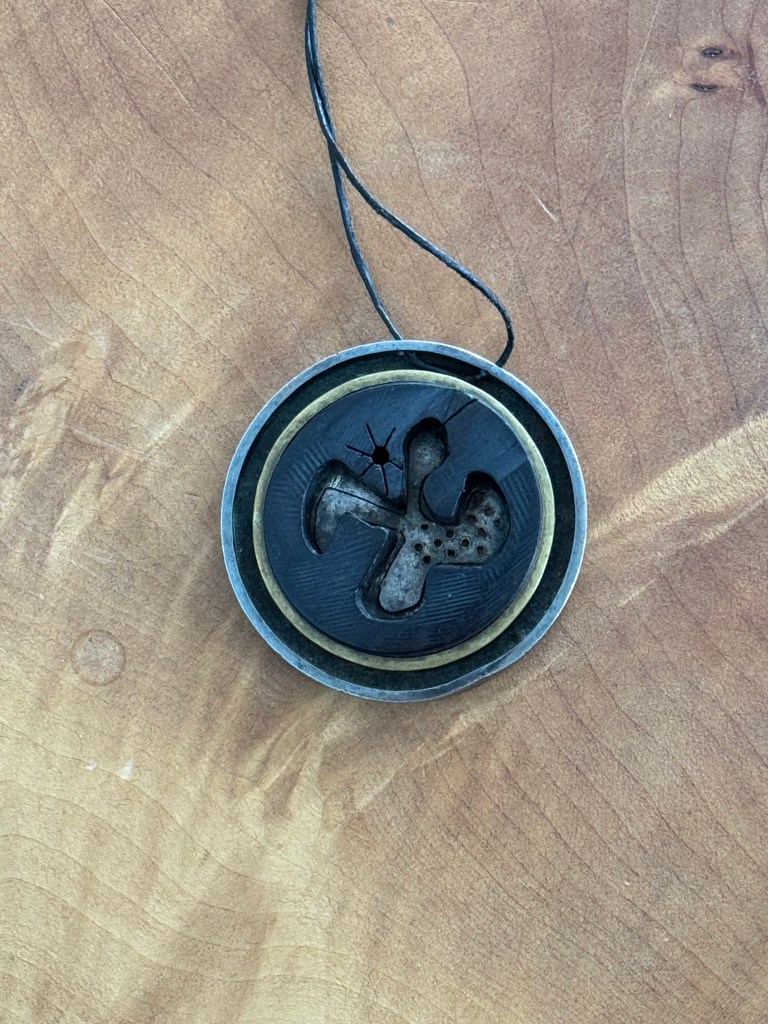 I decided I wanted to write about my mother’s Macchiarini pendant. My sister took it from her house after her death and gave it to me, thinking it suited me. I agree. Mom loved the work of Peter Macchiarini, an American Modernist jeweller (1909-2001) from North Beach, San Francisco. The several pieces my mother owned were passed down to us, her daughters. I have a couple of brooches, the pendant, and two belt buckles, and my sisters have other examples of his work.