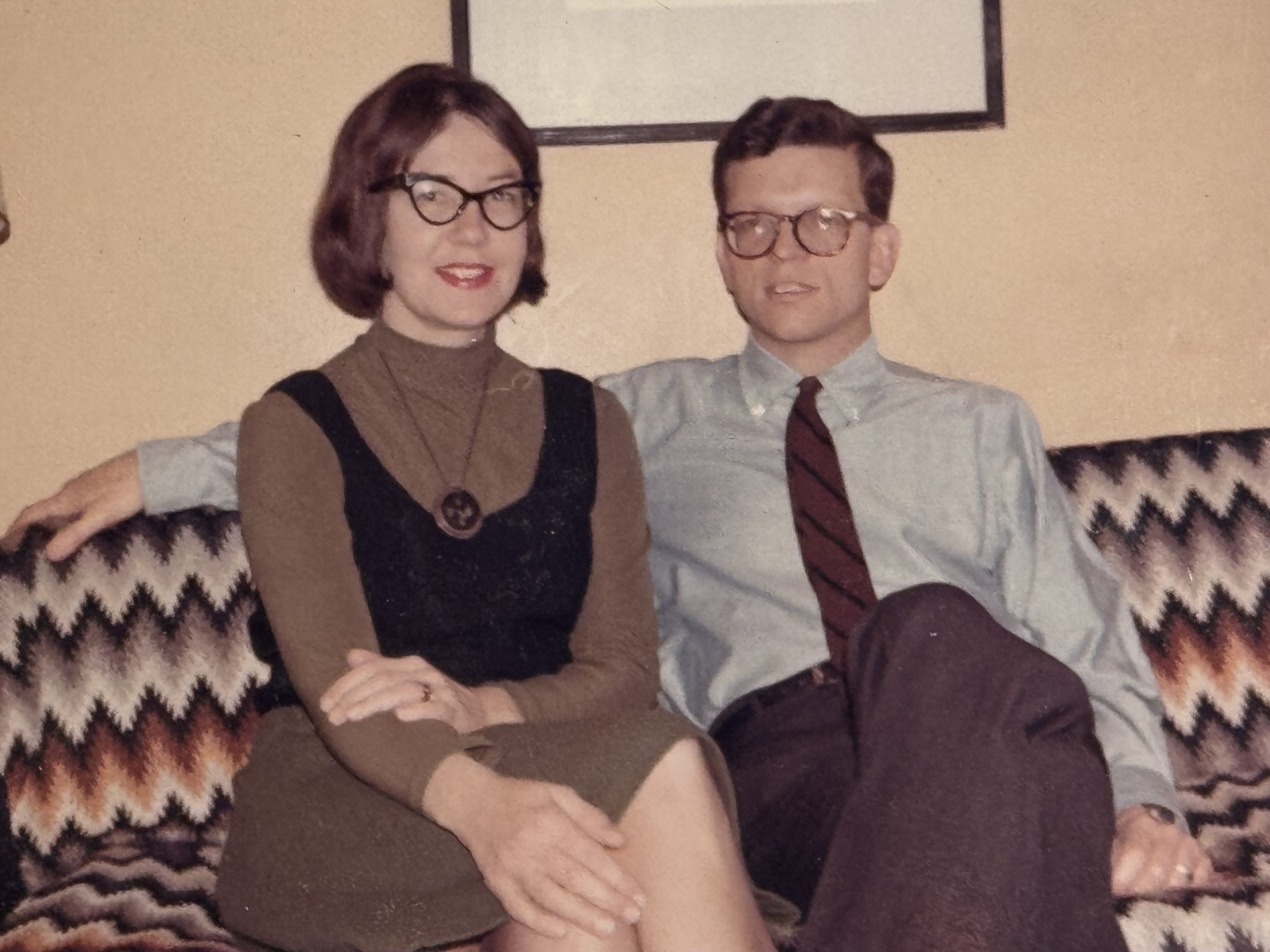 I want the pendant to tell a story—a story about my mother’s love for mid-century art, particularly from the Bay Area. Mom knew Peter, or at least I think she told me she did. She must have had anecdotes about how she bought the jewelry, what he was like, her San Francisco connection to him. She wore this pendant often, her signature piece. The photo of her and my dad shows her wearing it in 1964. She is wearing it again in the photo with her cat when she was in her sixties.