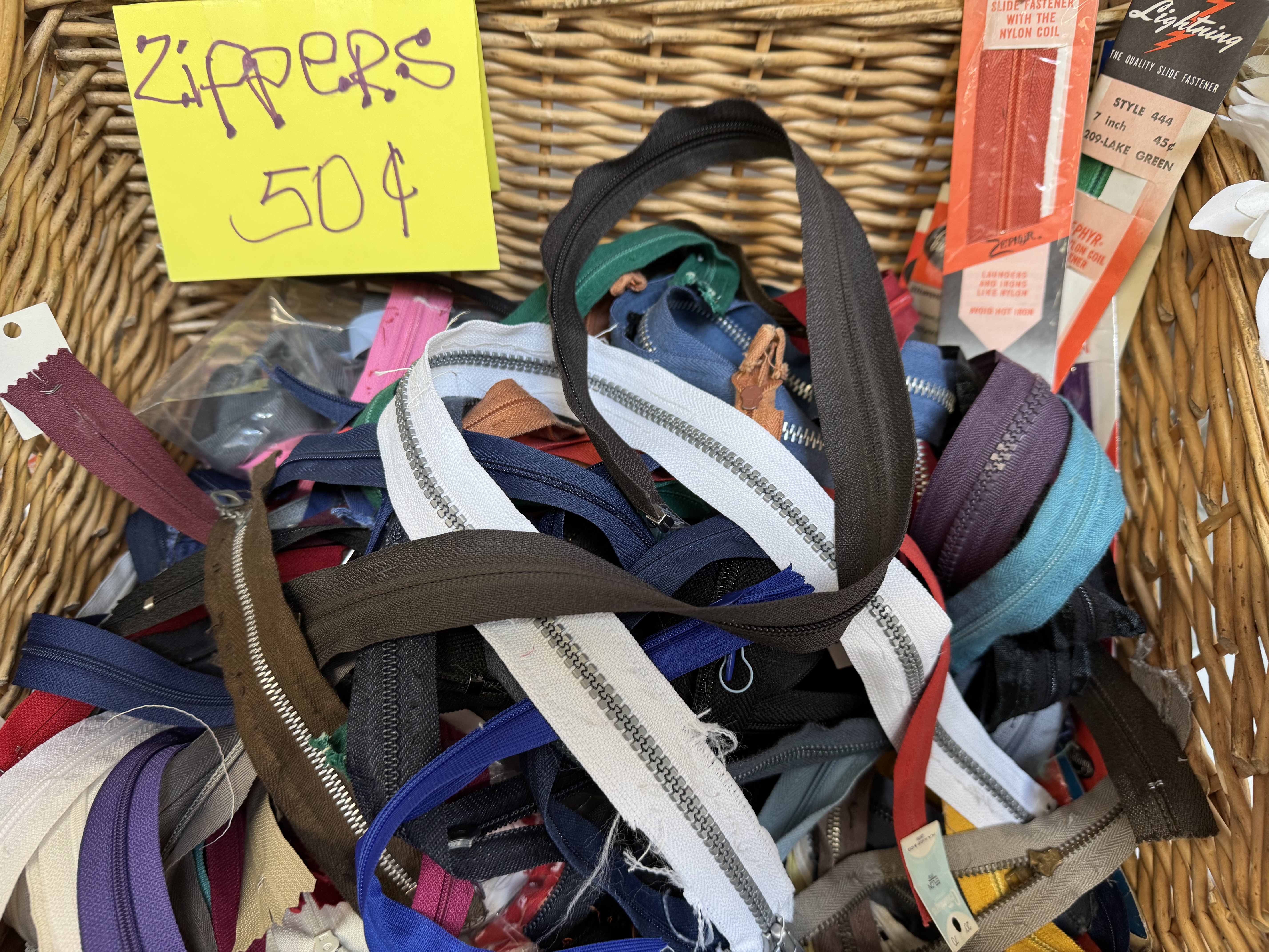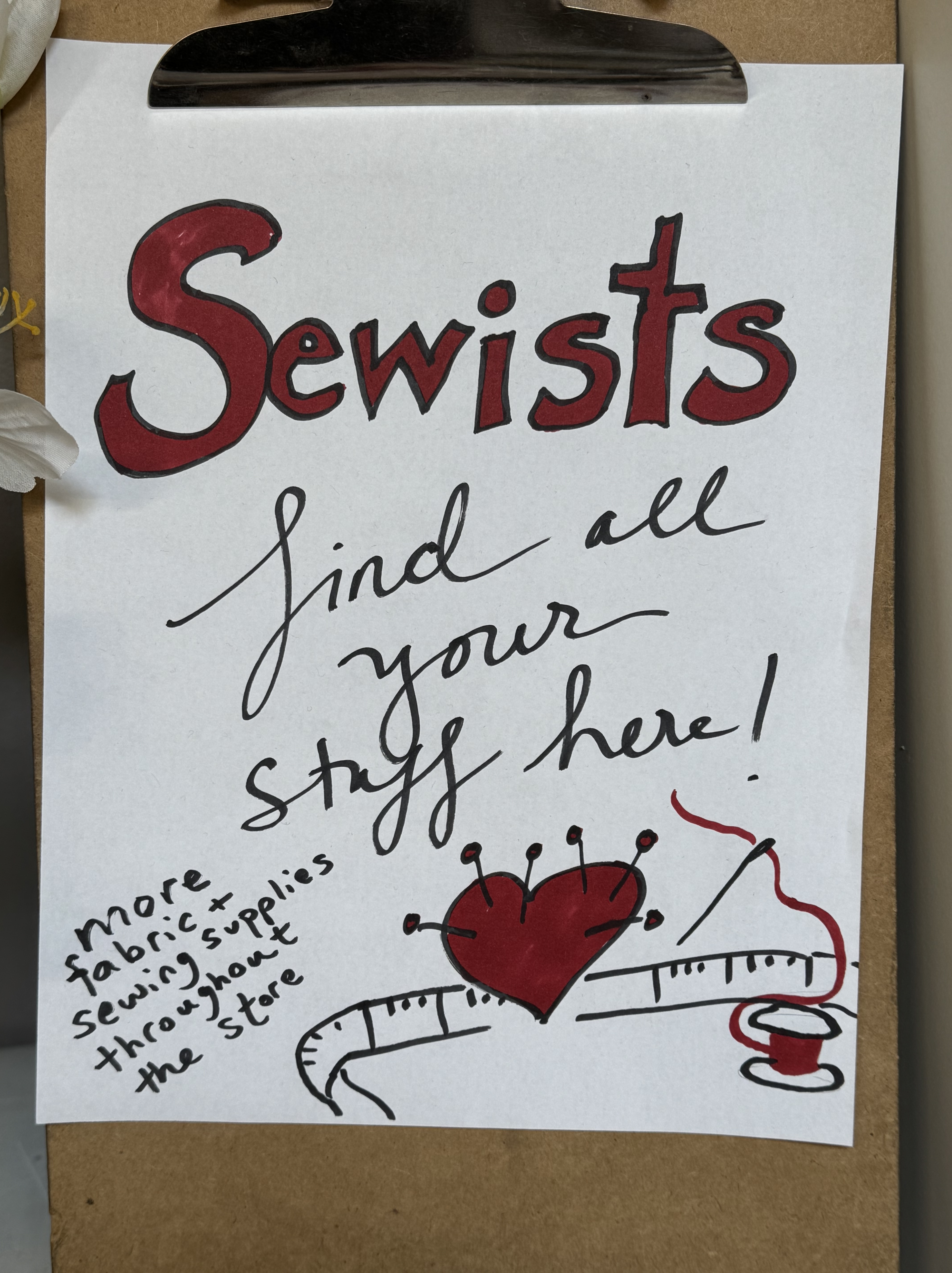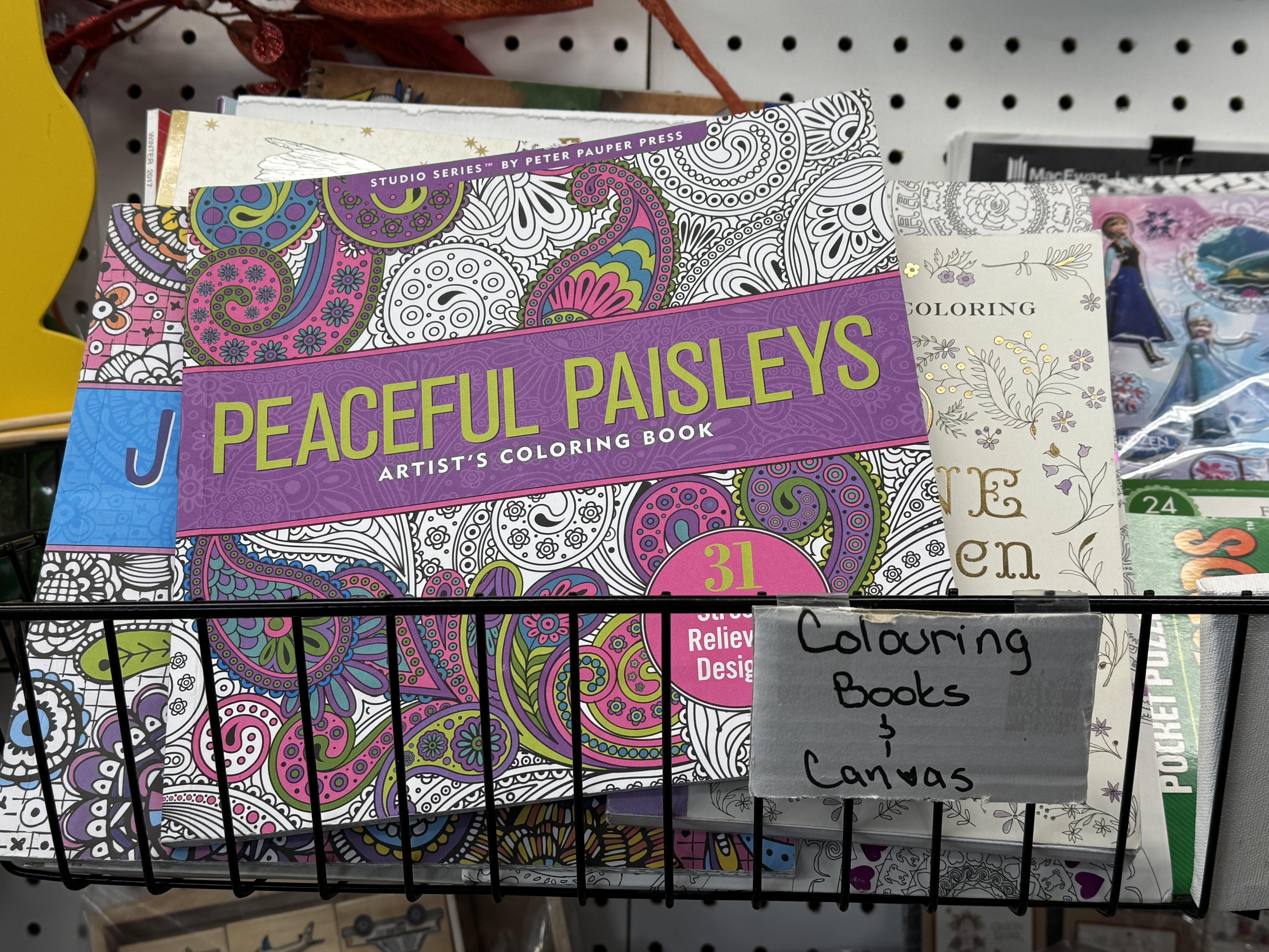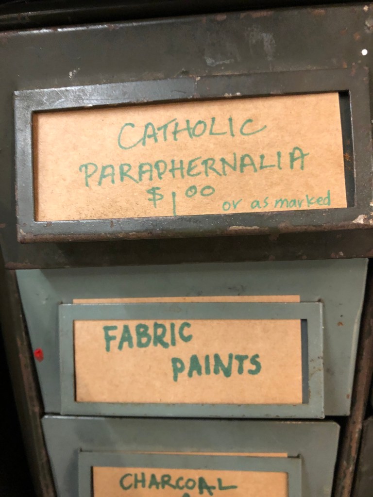 People stream into the store. Have you got books on stained glass? Do you have leatherwork tools? Ever get pillow inserts? Sometimes I say no, sometimes yes, but other times I’m not sure, and we set out to look together, sifting through the boxes and baskets. Sometimes people cry out in delight when they find just what they were looking for. A particular size of crochet hook, fabric printed with mushrooms, a colouring book of Frida Kahlo drawings.