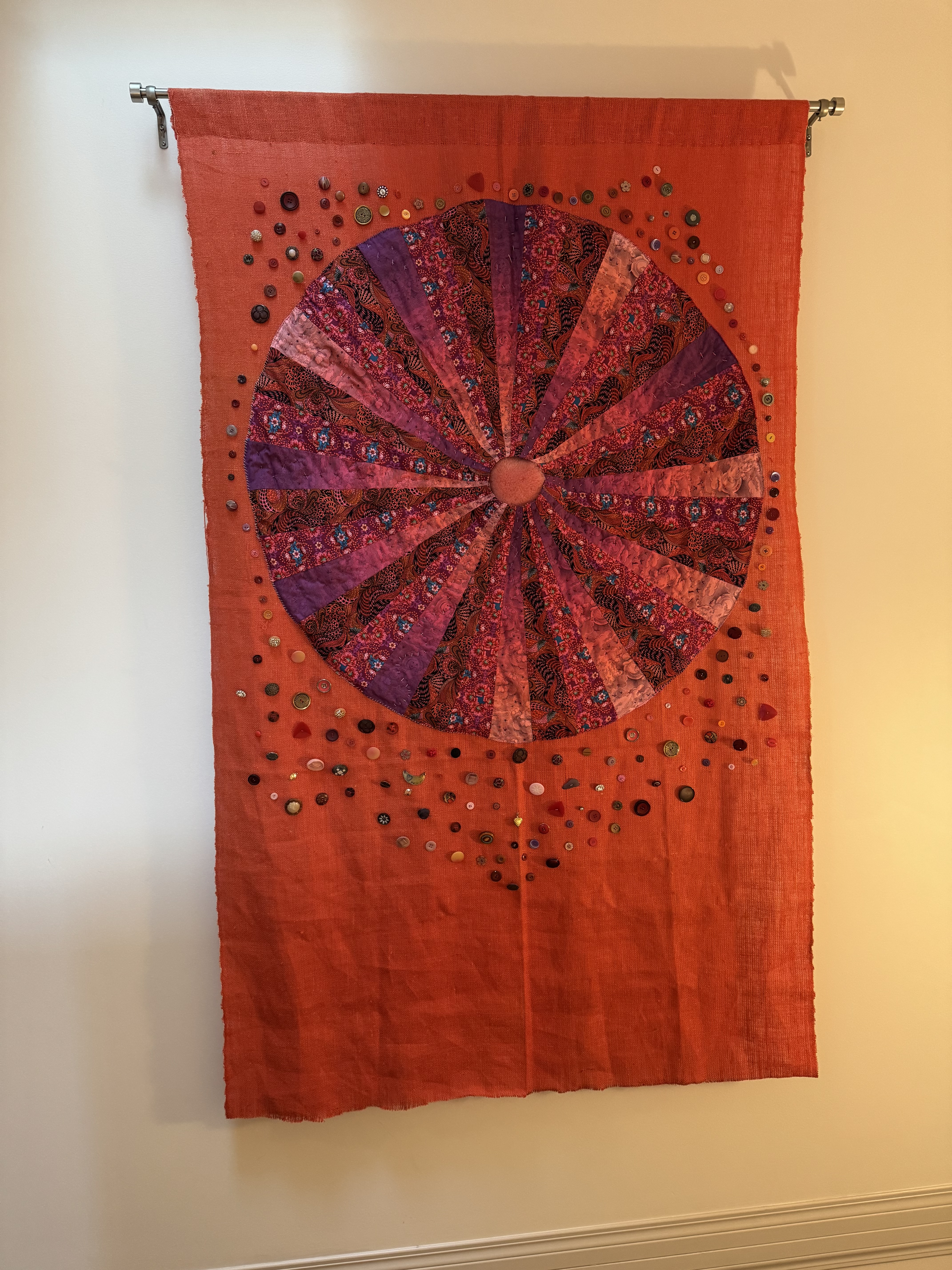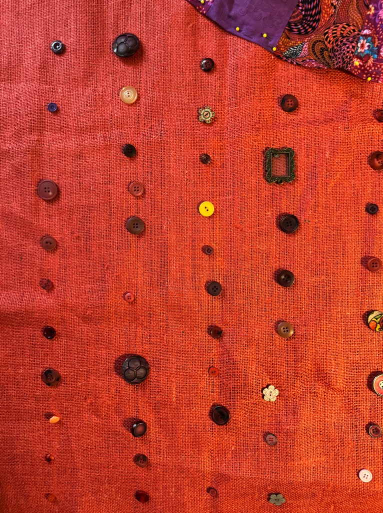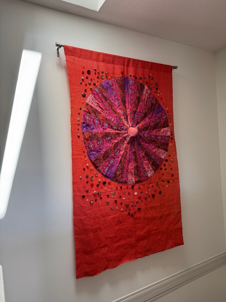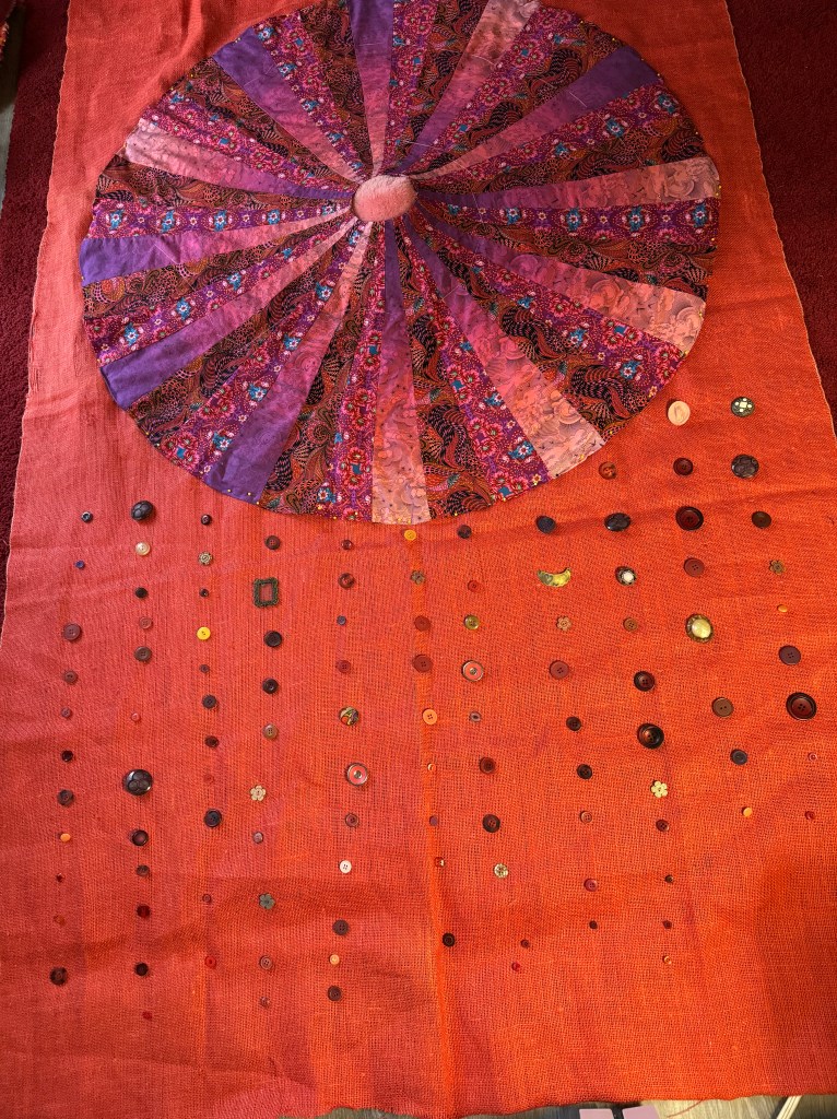 Immersing yourself in a creative project can lift your mood, and we could all use some mood uplift now. Am I right? I am presently working on “Ten Thousand Joys,” a large wall hanging in oranges, pinks, reds, and purples. At its centre is a fabric circle I created using a ten-degree wedge. I cut and sewed three alternating brightly-patterned fabrics together to make this 45-inch mandala. I cut an old blanket into cascading circles to lay under the mandala to create a three-dimensional effect. At the centre, the bit of pink sheepskin peeps through. I basted the padding onto a big piece of orange burlap I found at Value Village and then basted the circle onto the padding. Now I am in the process of using embroidery thread to sew the circle onto its backing at the circumference. I’ll add lots of embroidery stitches in bright colours, zig-zagging up and down the long wedges. The hanging will be finished by sewing on, not ten thousand, but dozens of pink, red, and purple buttons around the central circle. It feels inevitable that I will make a “Ten Thousand Sorrows” wall hanging next.