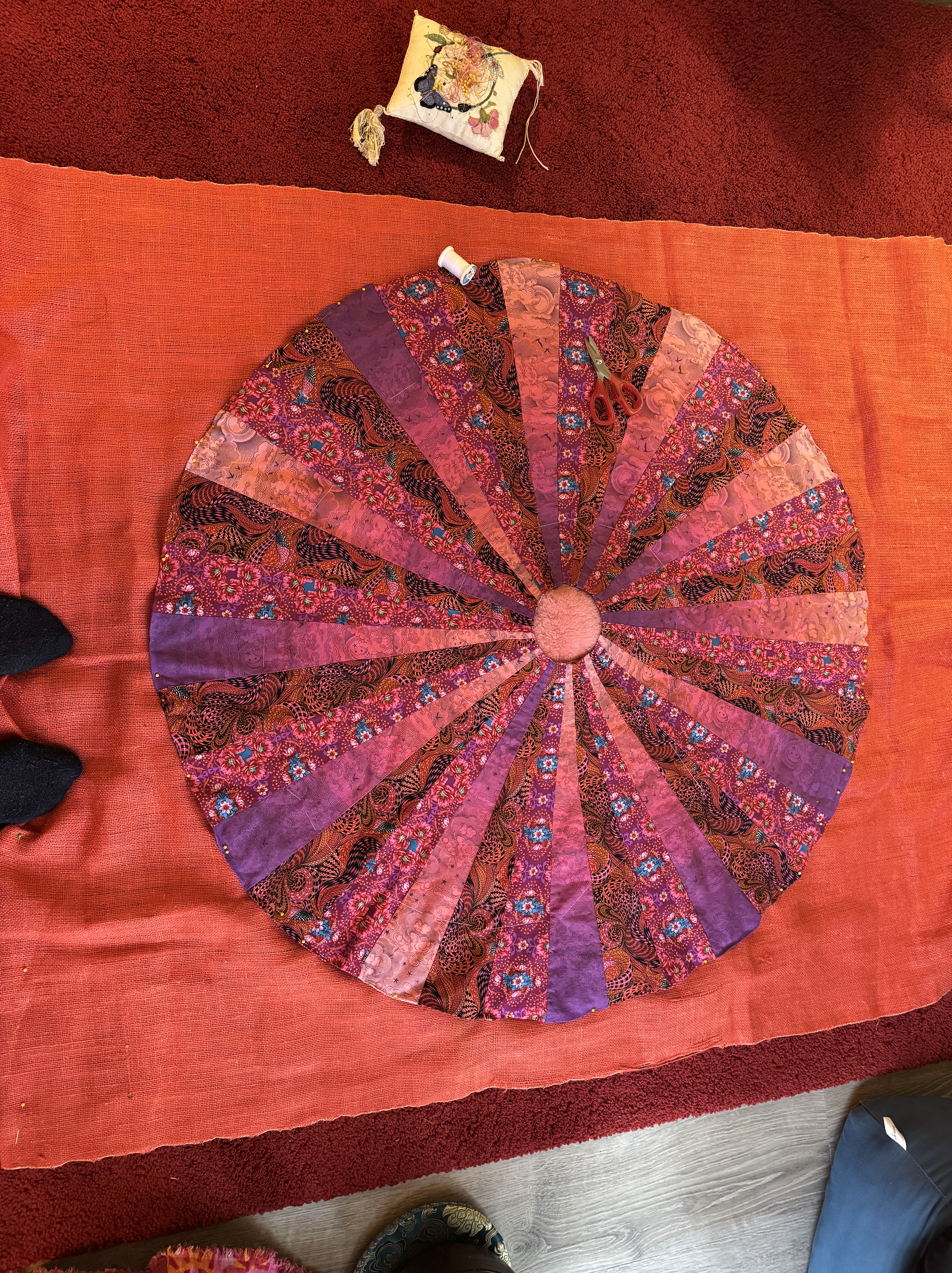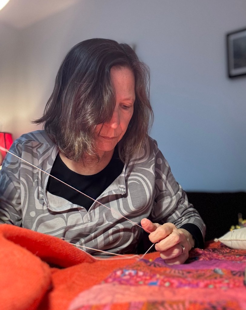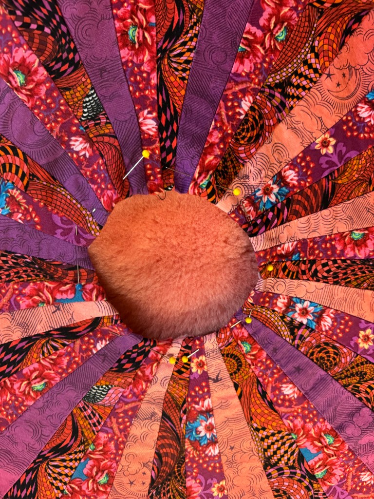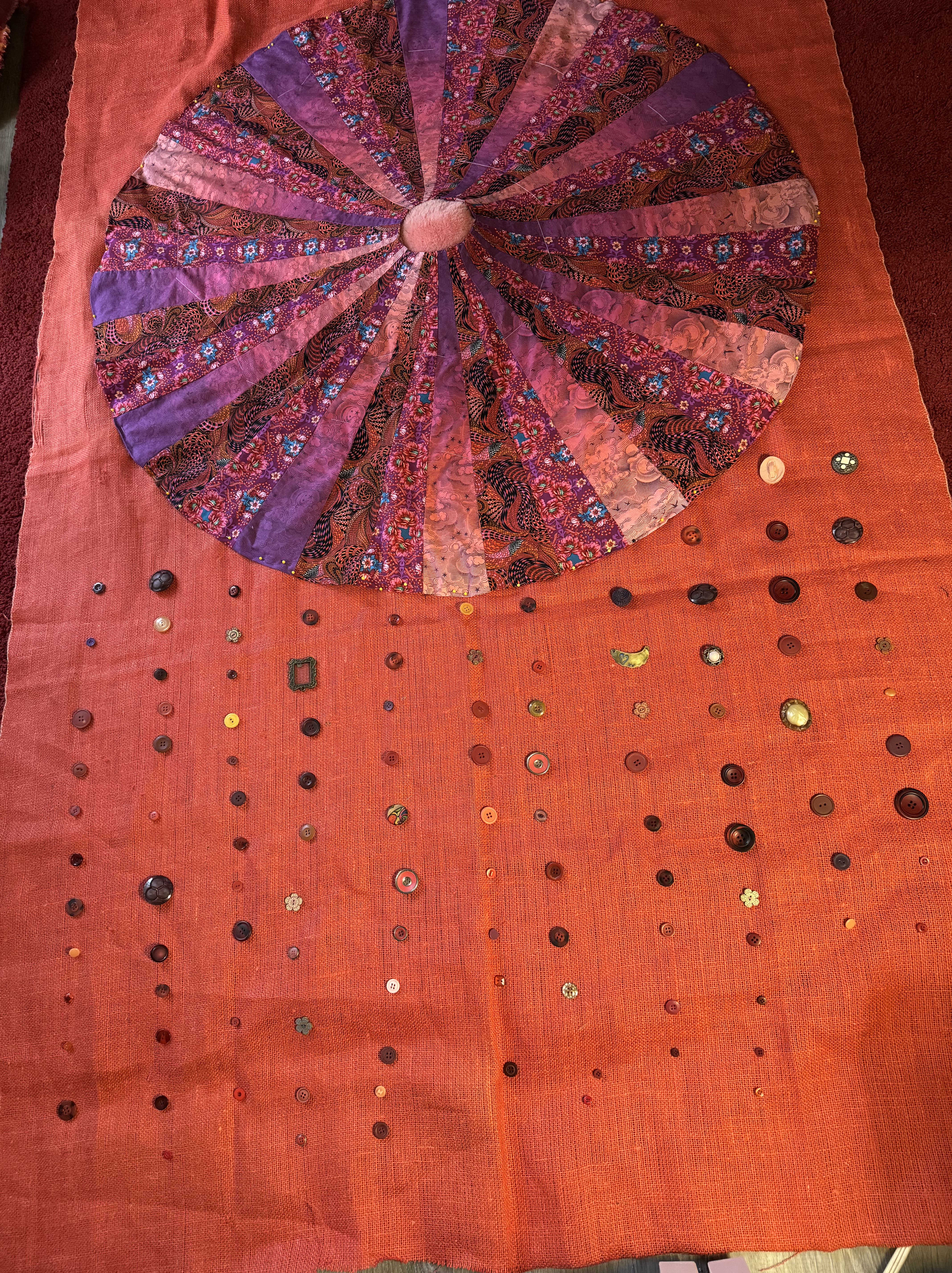 Immersing yourself in a creative project can lift your mood, and we could all use some mood uplift now. Am I right? I am presently working on “Ten Thousand Joys,” a large wall hanging in oranges, pinks, reds, and purples. At its centre is a fabric circle I created using a ten-degree wedge. I cut and sewed three alternating brightly-patterned fabrics together to make this 45-inch mandala. I cut an old blanket into cascading circles to lay under the mandala to create a three-dimensional effect. At the centre, the bit of pink sheepskin peeps through. I basted the padding onto a big piece of orange burlap I found at Value Village and then basted the circle onto the padding. Now I am in the process of using embroidery thread to sew the circle onto its backing at the circumference. I’ll add lots of embroidery stitches in bright colours, zig-zagging up and down the long wedges. The hanging will be finished by sewing on, not ten thousand, but dozens of pink, red, and purple buttons around the central circle. It feels inevitable that I will make a “Ten Thousand Sorrows” wall hanging next.