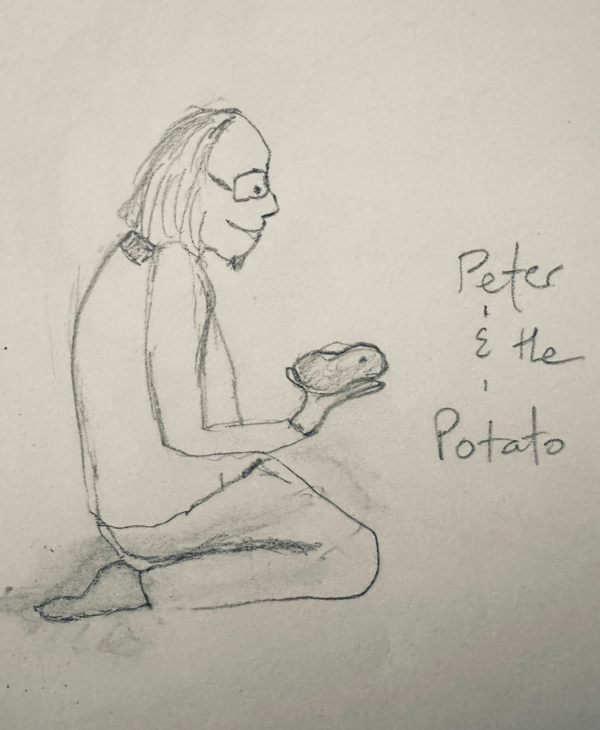 Oh Benji, Benji. Out of my peripheral vision, I could see Alma bent deep over his little body as I pumped the bike, swooshing down the road and around the corner. It took us only a minute to get to Peter’s. We knocked on the door, no answer, so I figured he was in the garden. We trod the narrow path beside the cottage. His back was to us as he sat on his haunches, examining a potato he had just dug from the soil. I looked fondly at the blue indigo cloth straining across the breadth of his back, a breadth of skin and warm muscle I had run my hands over just last night. My knees trembled with desire as I approached him with Benji now in my arms, Alma hobbling behind me.