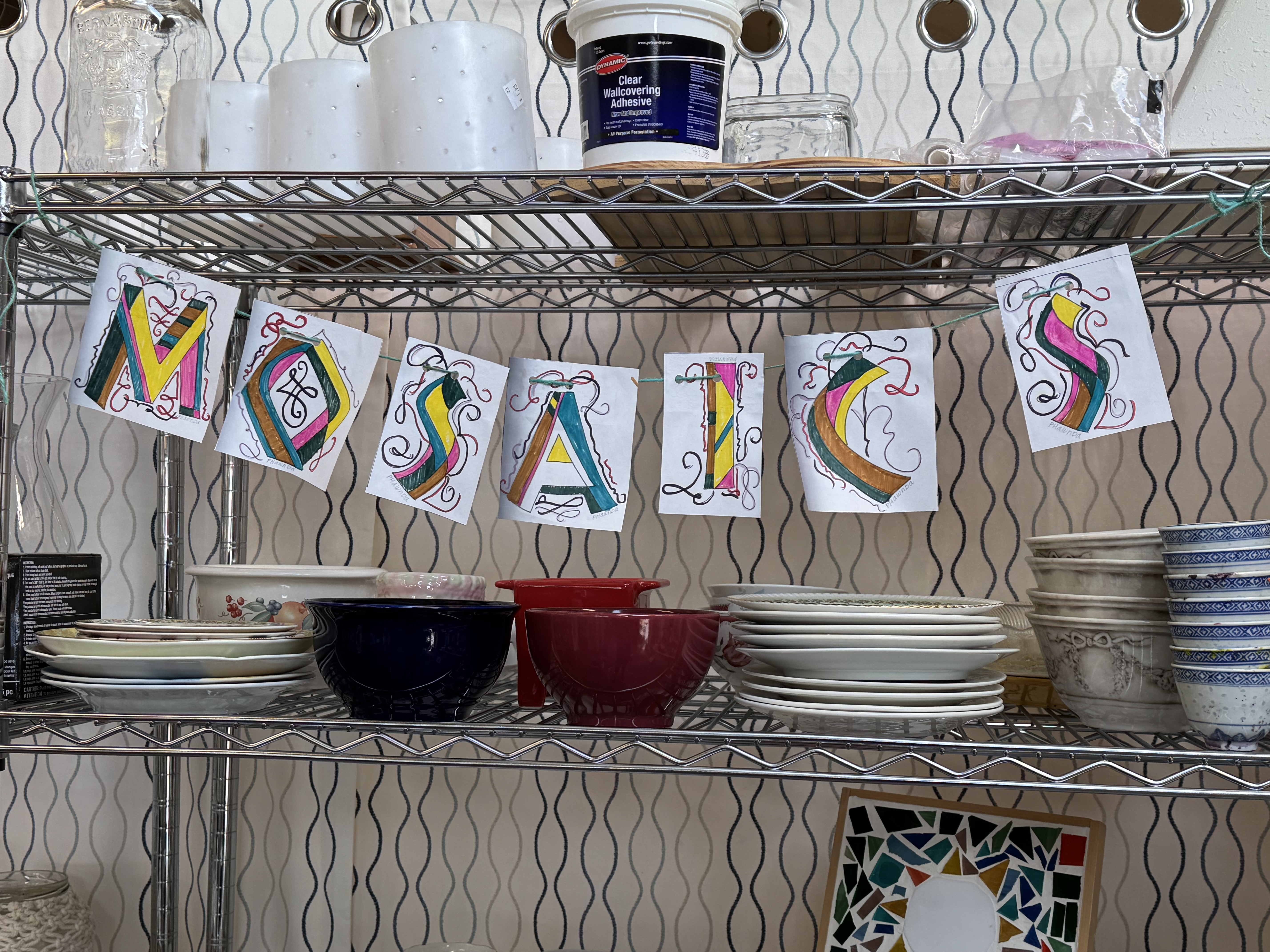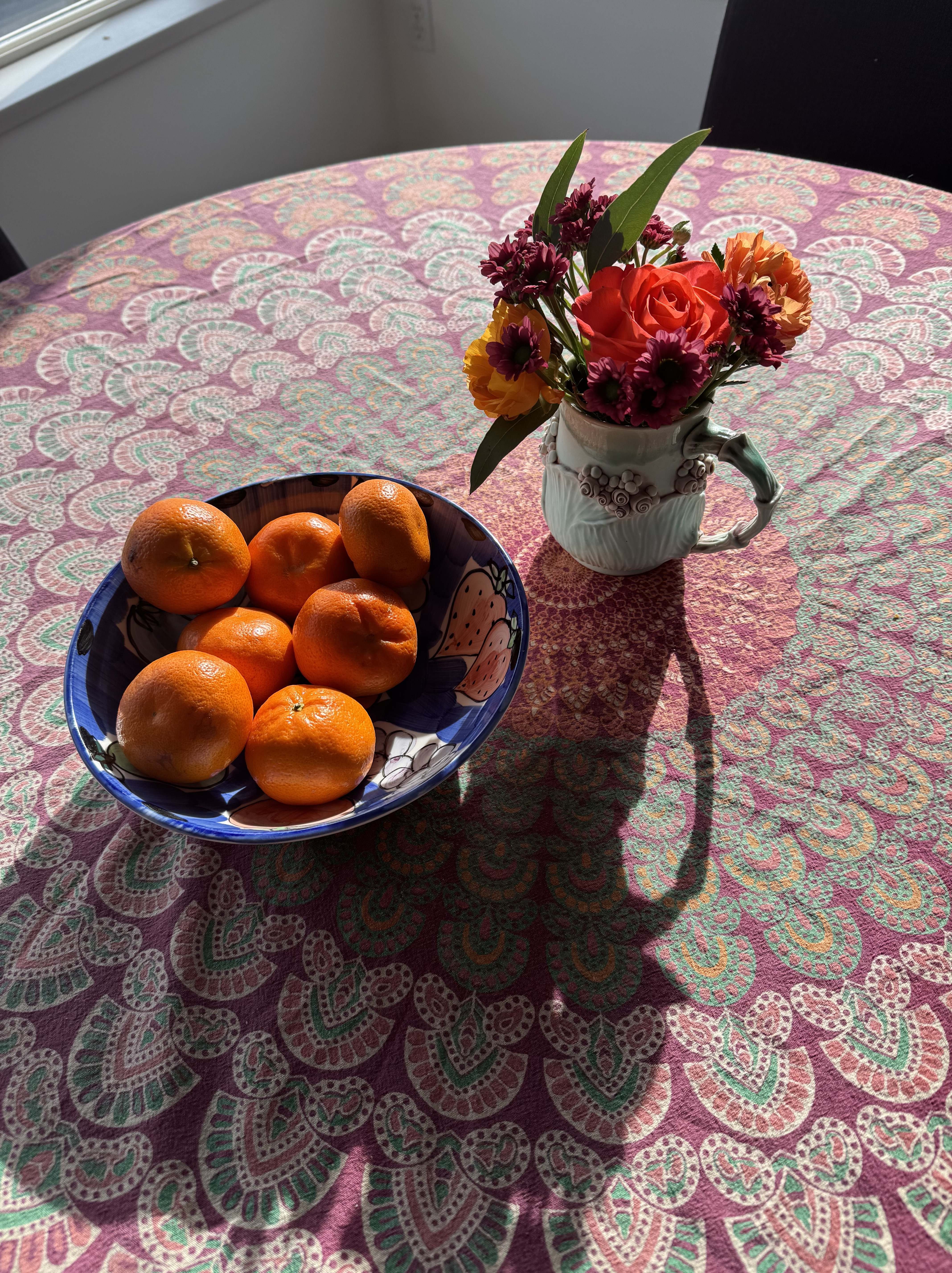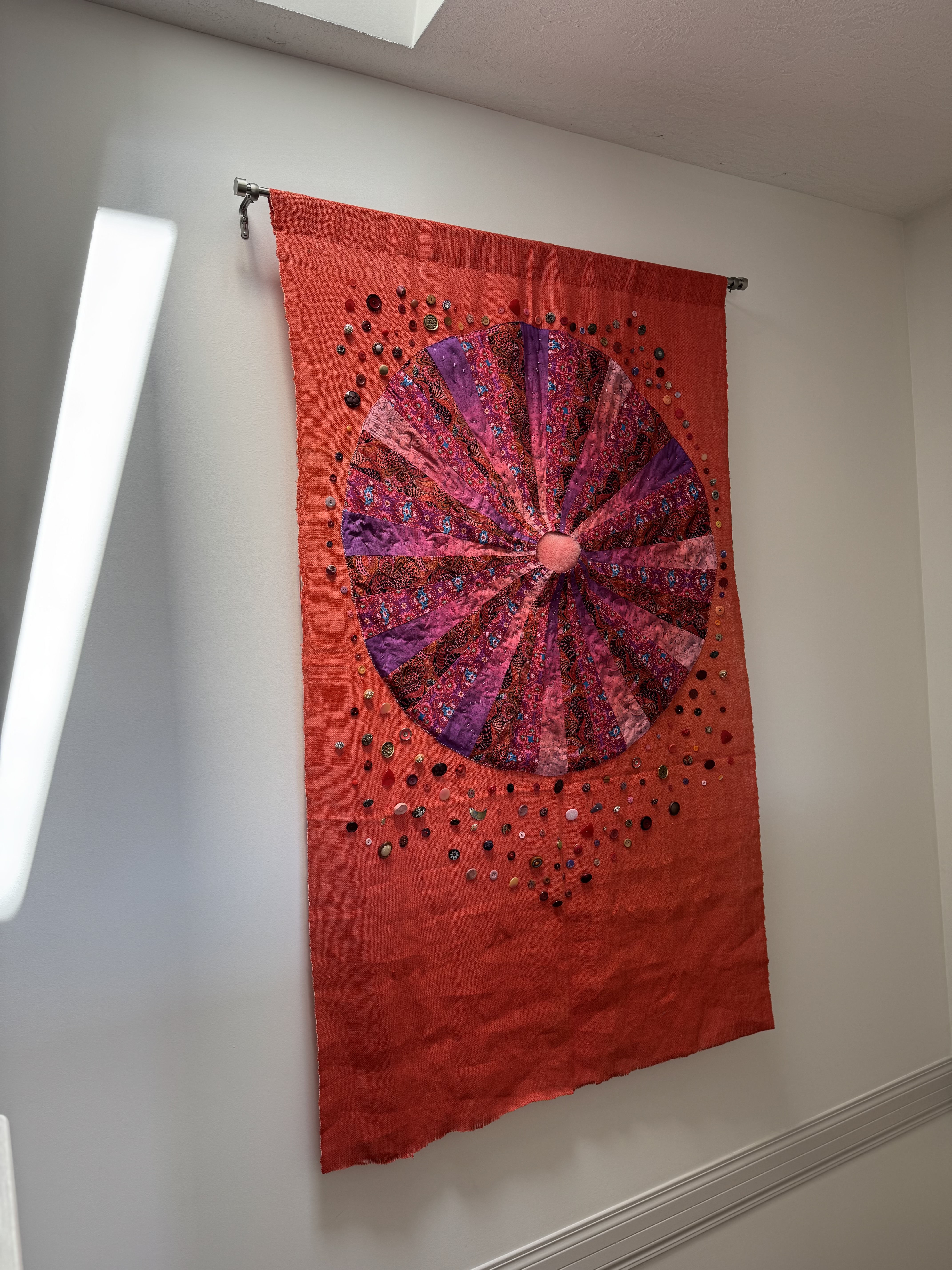 The wall hanging seems to collect the sunlight falling in through the skylight and send back a peachy radiance. Several times now I’ve gone to flick the hall light off, thinking the switch is on when it shouldn’t be. No, the light is off, but 10,000 joys shed their own uncanny light.