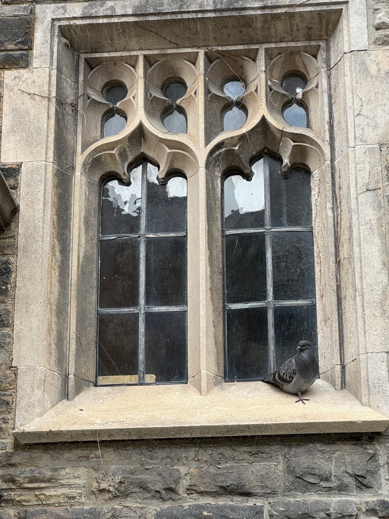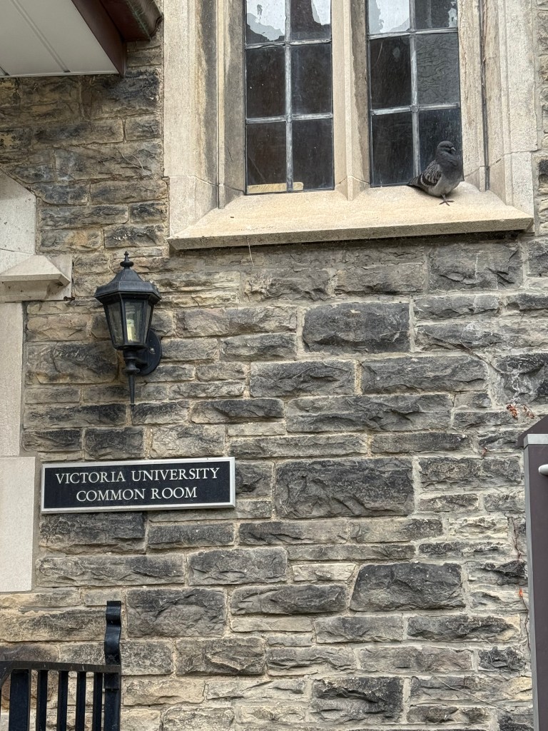 I was a lonely young woman. Barry Lopez writes that “It is not possible for human beings to outgrow loneliness,” and that seems true to me. Though I’m not as lonely as I was. I admire a pigeon perched in the recessed window of the Victoria University Common Room.
