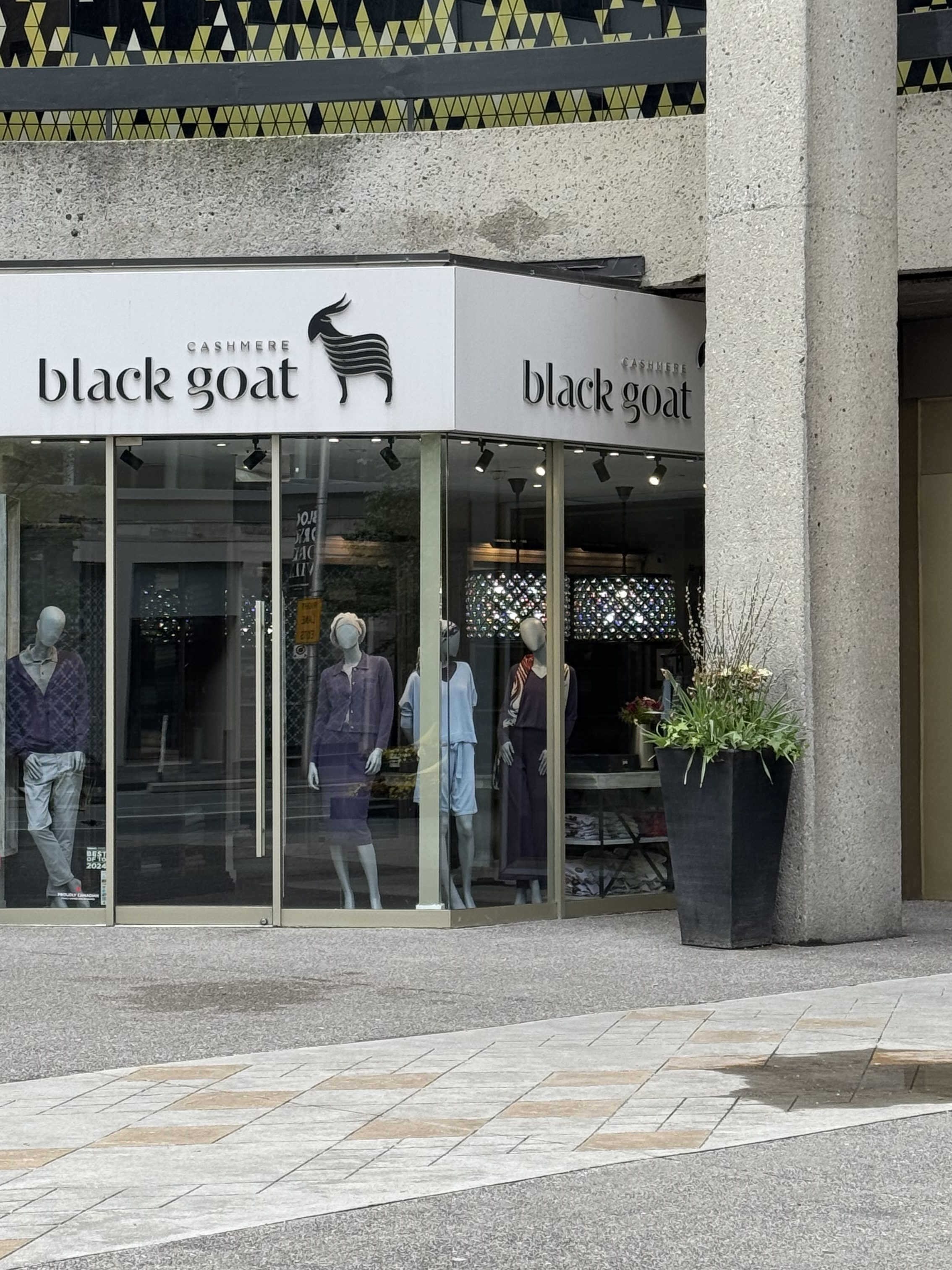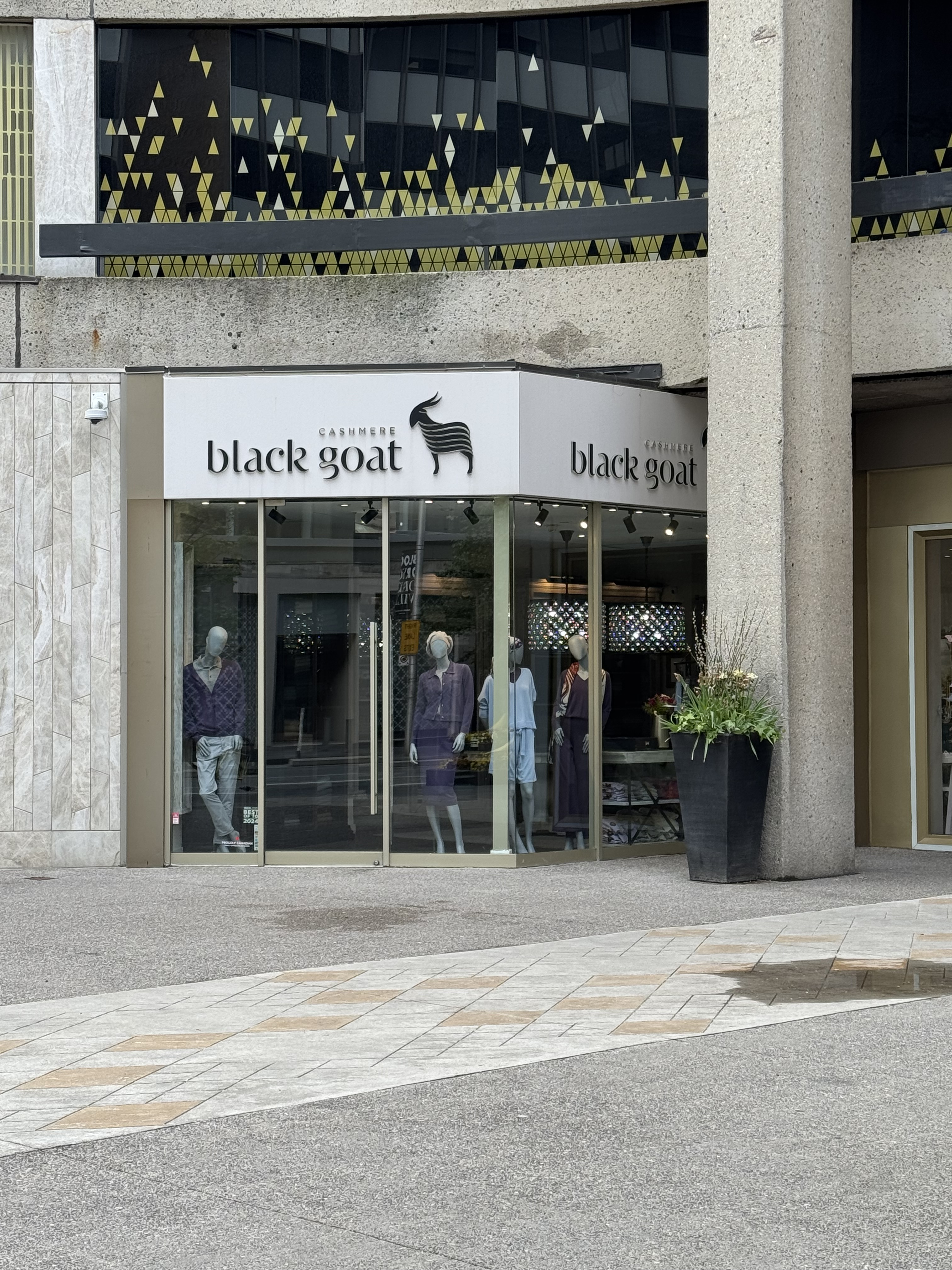 It’s cold in Toronto for late May. I wear a toque, jacket, leather gloves. But now I wish I’d brought a scarf. I admire the scarves in the window of Black Goat Cashmere, next to Ashley’s in what used to be called the Colonnade. This mall was one of my mother’s favourite places; after window shopping Bloor Street arm in arm, we’d drink coffee and eat pastries at the Coffee Mill at the back of the Colonnade.