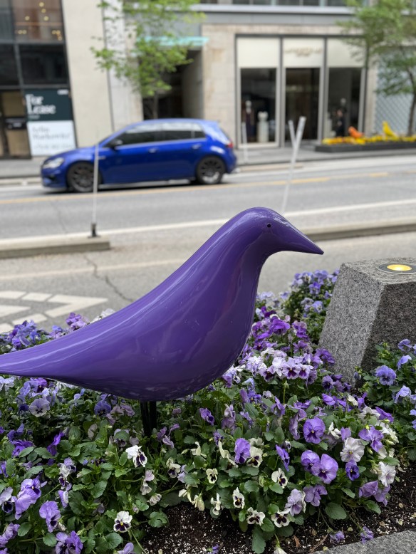 I have been walking Bloor Street West. First, the Mink Mile, that stretch between Yonge and Avenue Road lined with the tall glass storefronts: Zara, Birks, Lululemon, Holt Renfrew. Rich people shop here. Very few birds fly above these tall, inhospitable stores. Instead, big bird shapes in bright shiny colours line the sidewalks, ghosts of extinct species.