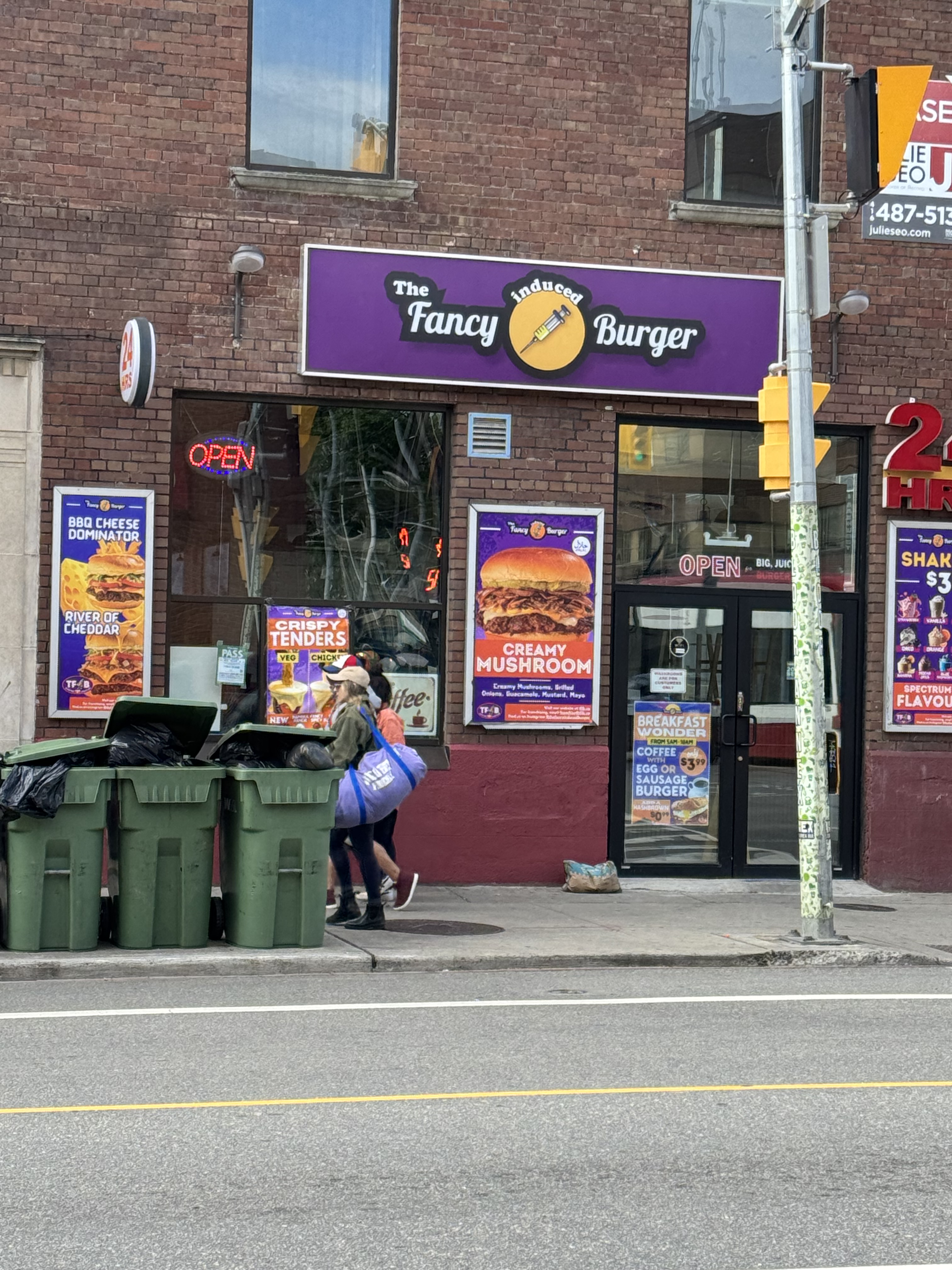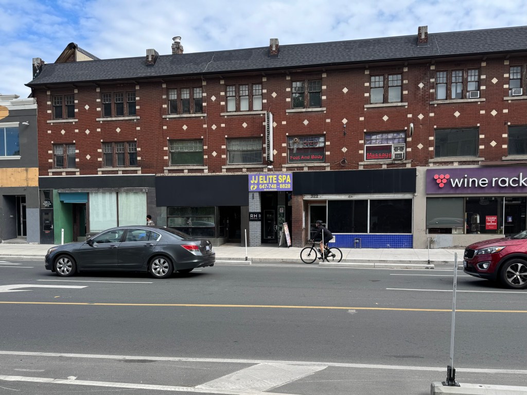 I keep walking. The Hungarian restaurant where we ordered dumplings and gravy and goulash soup: gone. The delicatessen and the cheese shop with a cow in the window: both gone. The café that once took up that southeast corner of Bloor and Bathurst: gone. Now there’s a Fancy Burger outlet, where you can add a syringe cheese shot to your beef patty for $1.49. This part of Bloor continues to metamorphize. Ethnic restaurants and record stores turn into cannabis shops and bubble tea counters. Used bookstores become pet pampering salons and tattoo parlours.
