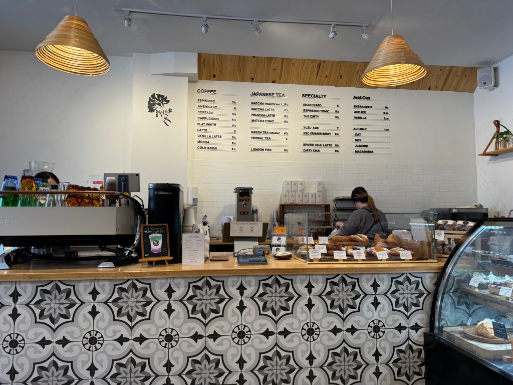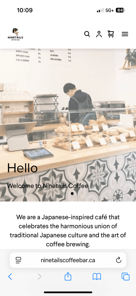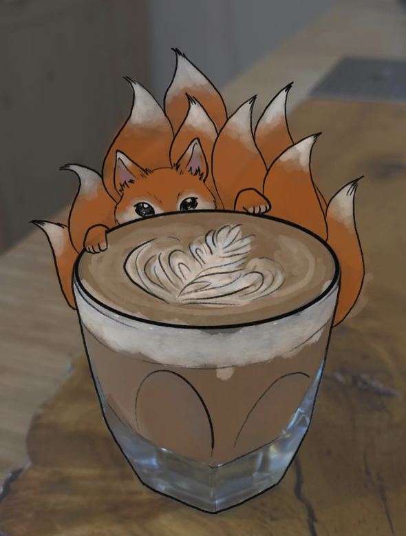 I keep walking, knowing that somewhere soon, I will come upon something interesting. I pass the small corner grocers, happy to see they still sell bargain produce and hanging pots of flowers. I pass Euclid, cross to the south side, and then, suddenly, there is an A-Frame sandwich board picturing a fox with many tails. I walk into Ninetails Coffee Bar, where two young Japanese women bustle behind a honey-coloured wood counter. White walls, a few small round tables graced by simple folding chairs. A coffee bar decorated with ceramic tiles patterned in grey, blue, and white. A full pastry case. Smiling faces welcome me.