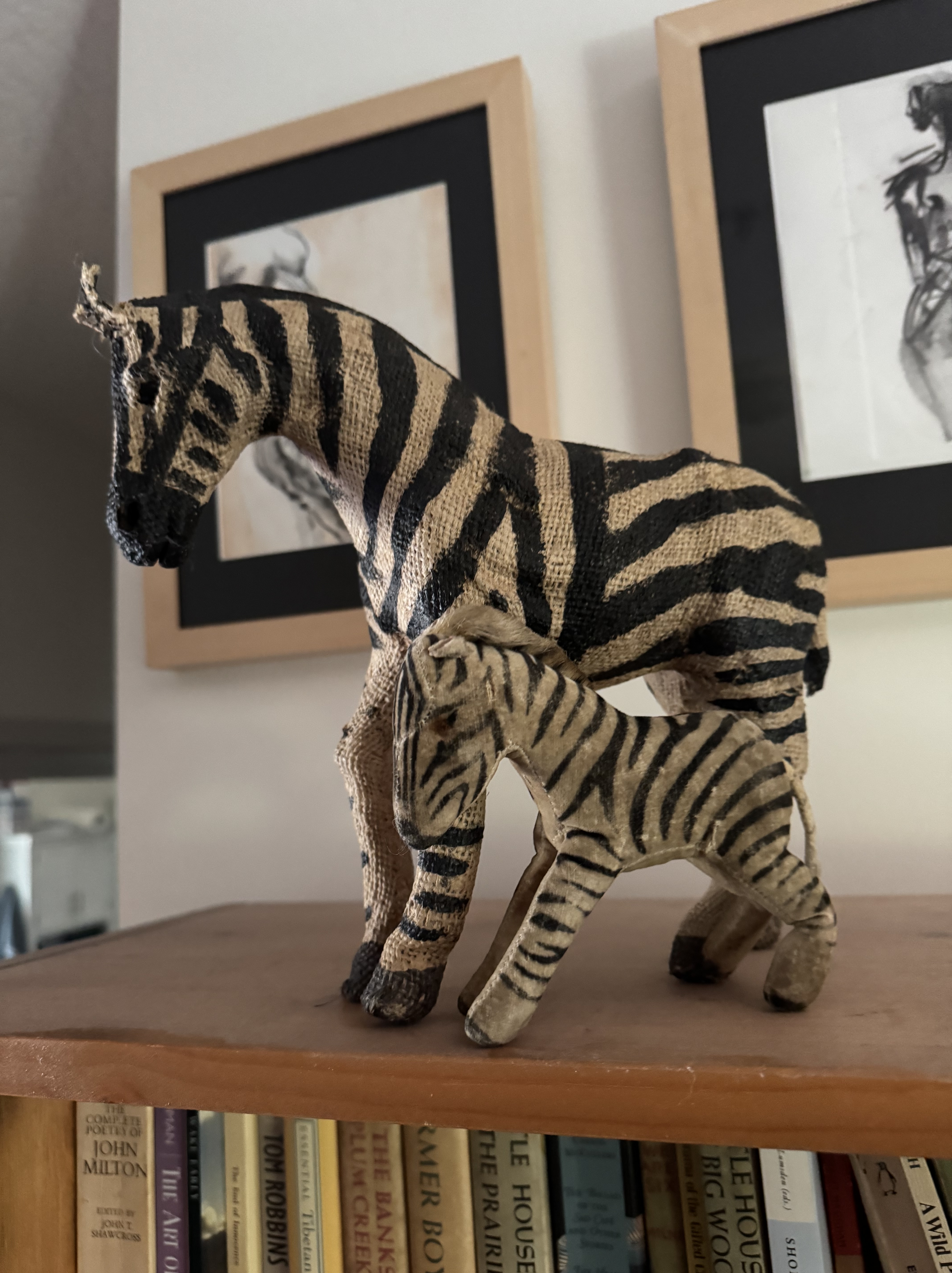The burlap bag was pure serendipity. Another magical find was a zebra at the ReStore in Langford. Purchased for 70 cents ($1.00 but there was a 30% off sale). This zebra is majestic, dignified, kind, warm. She stands about 10 inches high. Her stripes are unrealistic, but otherwise she is a convincing animal. I dug out a stuffed toy zebra I’d kept from childhood in a box under the stairs. It’s remarkable this sixty-year old stuffed animal still stands! They now live together, mother and child, atop a bookshelf in our bedroom. I like to gaze at them from bed. Something about them feels calming, comforting. I loved my zebra striped one-piece bathing suit when I was eight years old. When I wore it, my reward was a zebra tan that was pure magic.