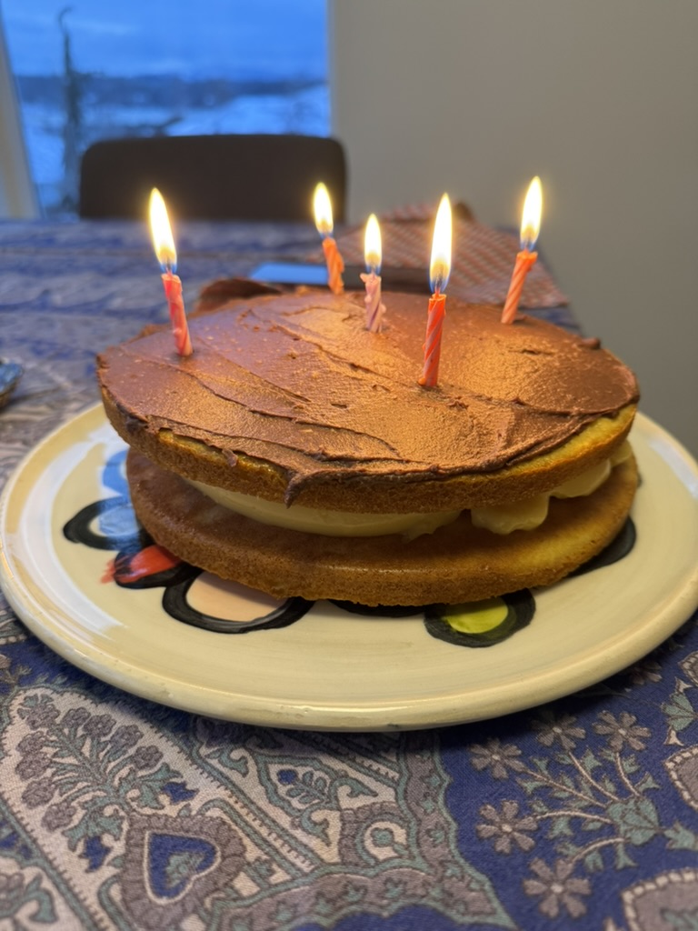 It’s my 67th birthday today, a good day to review the year in creation. What did I make this year? Eleven blog posts (this is the twelfth); a few stories, poems, and essays; felt birds for family members and felt Christmas decorations; three aprons (one for Nancy, one for Meytal, one for me); a baby quilt and matching pillow for the great grandson of my friend, Lillian; embroidered pillows for my niece; a patchwork pillow for my friend Janis; little zippered bags for everyone; “One Thousand Joys,” a wall hanging for our stairwell; a lunch bag for me; some drawings and comics; a sling bag for Nancy; some collages (thank you Kathryn for the inspiration); and cakes and more cakes for friends and family.