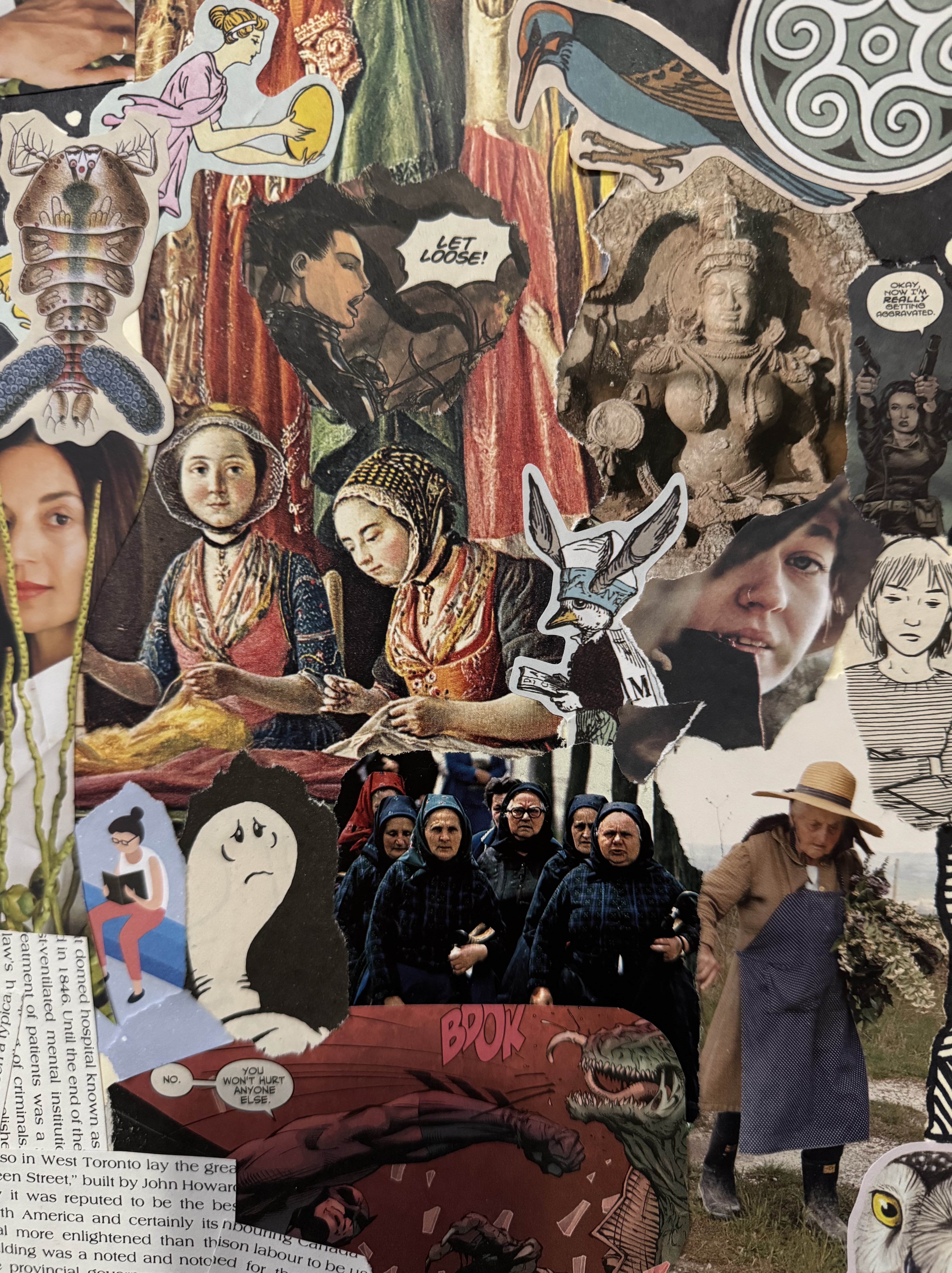 I went to collage club at the library Women of all ages were cutting up old magazines. Glue sticks and colourful scissors lay across white tables like sacred instruments.
