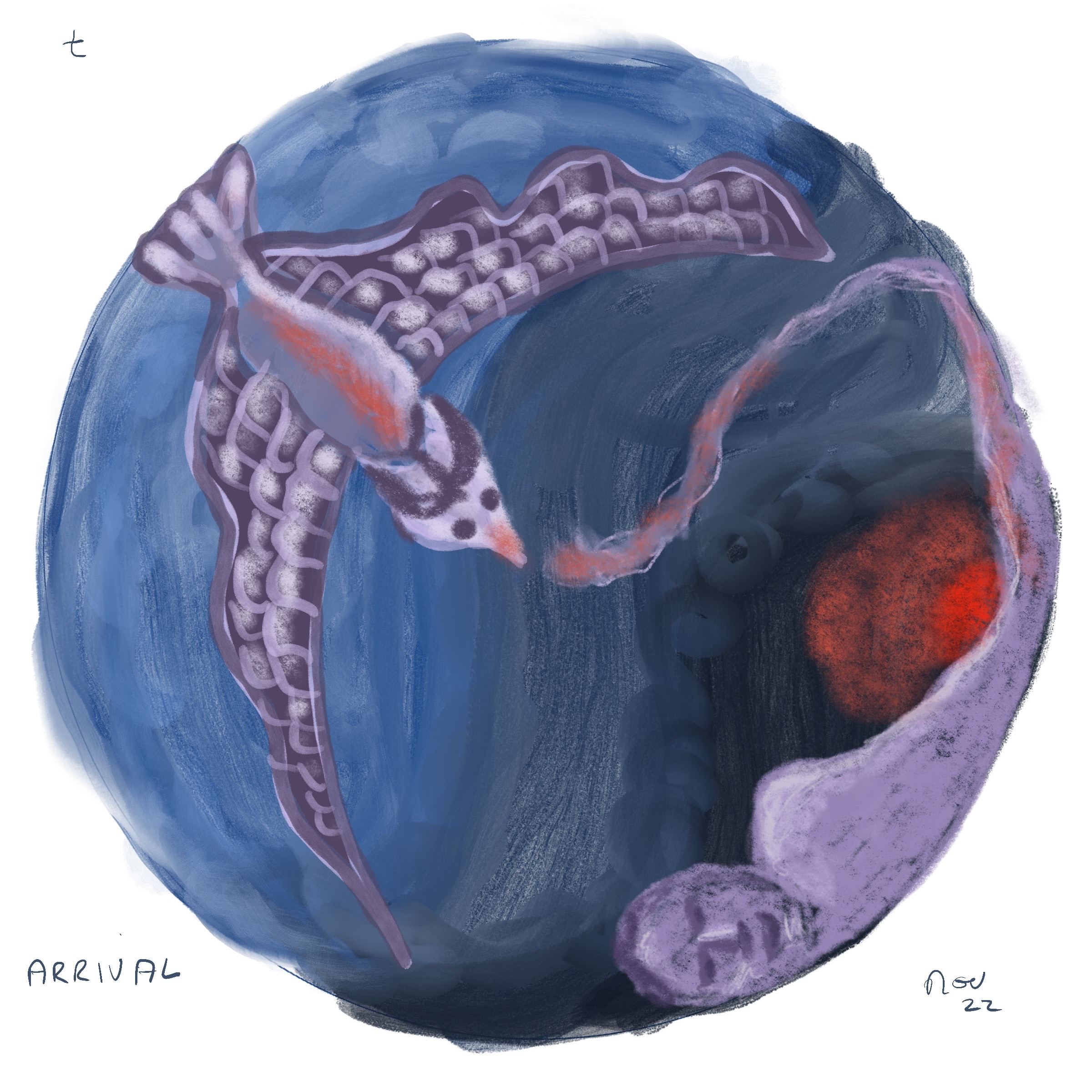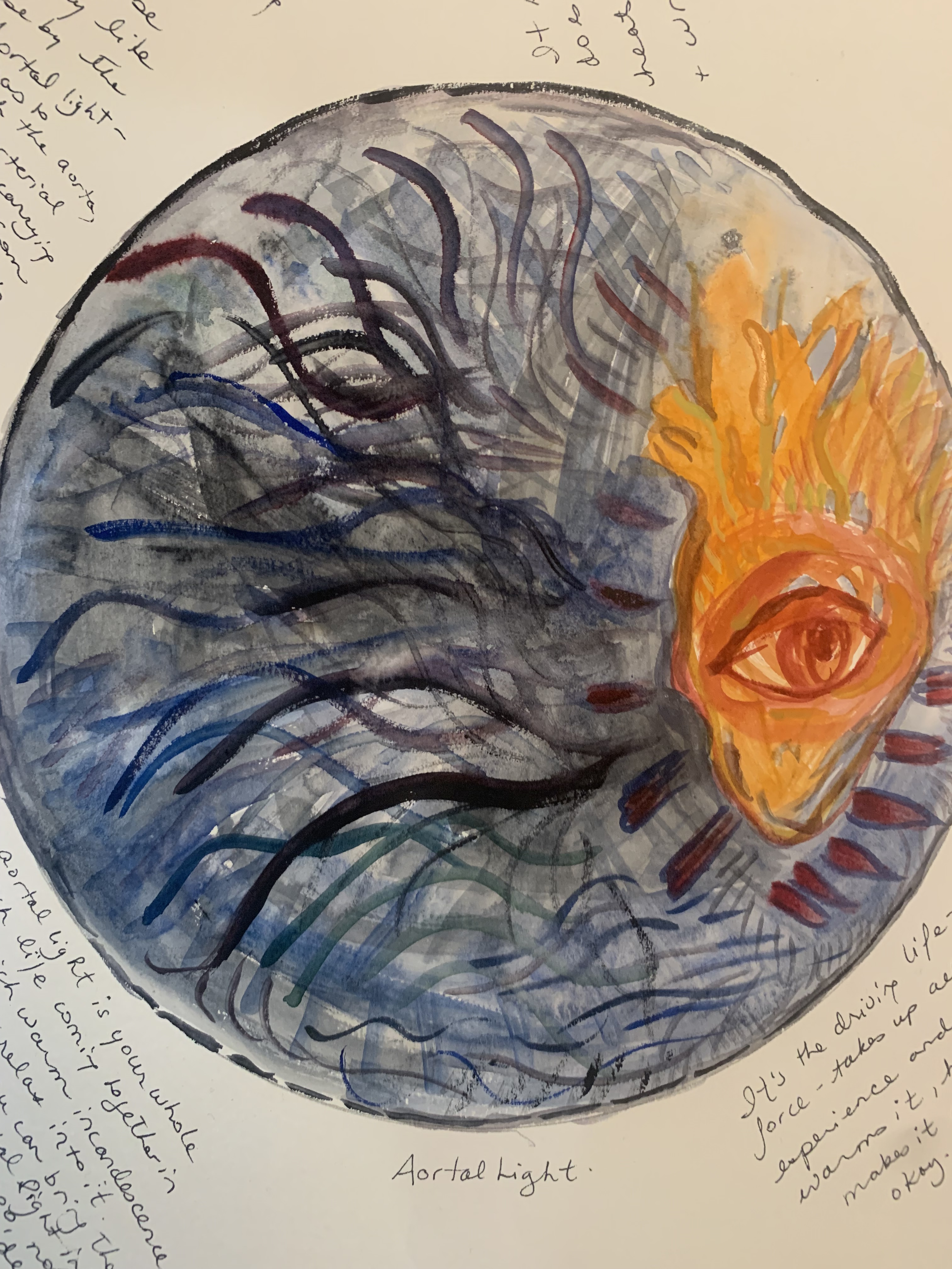 I got stuck on a phrase near the end of the poem, “aortal light.” Adjective + noun. Aortal – from aorta, the great arterial trunk that carries blood from the heart to be distributed by branch arteries through the body. I imagined aortal light as a lantern that pulses like a heart, sees all with a glowing eye. Warmth and insight at the end of life.