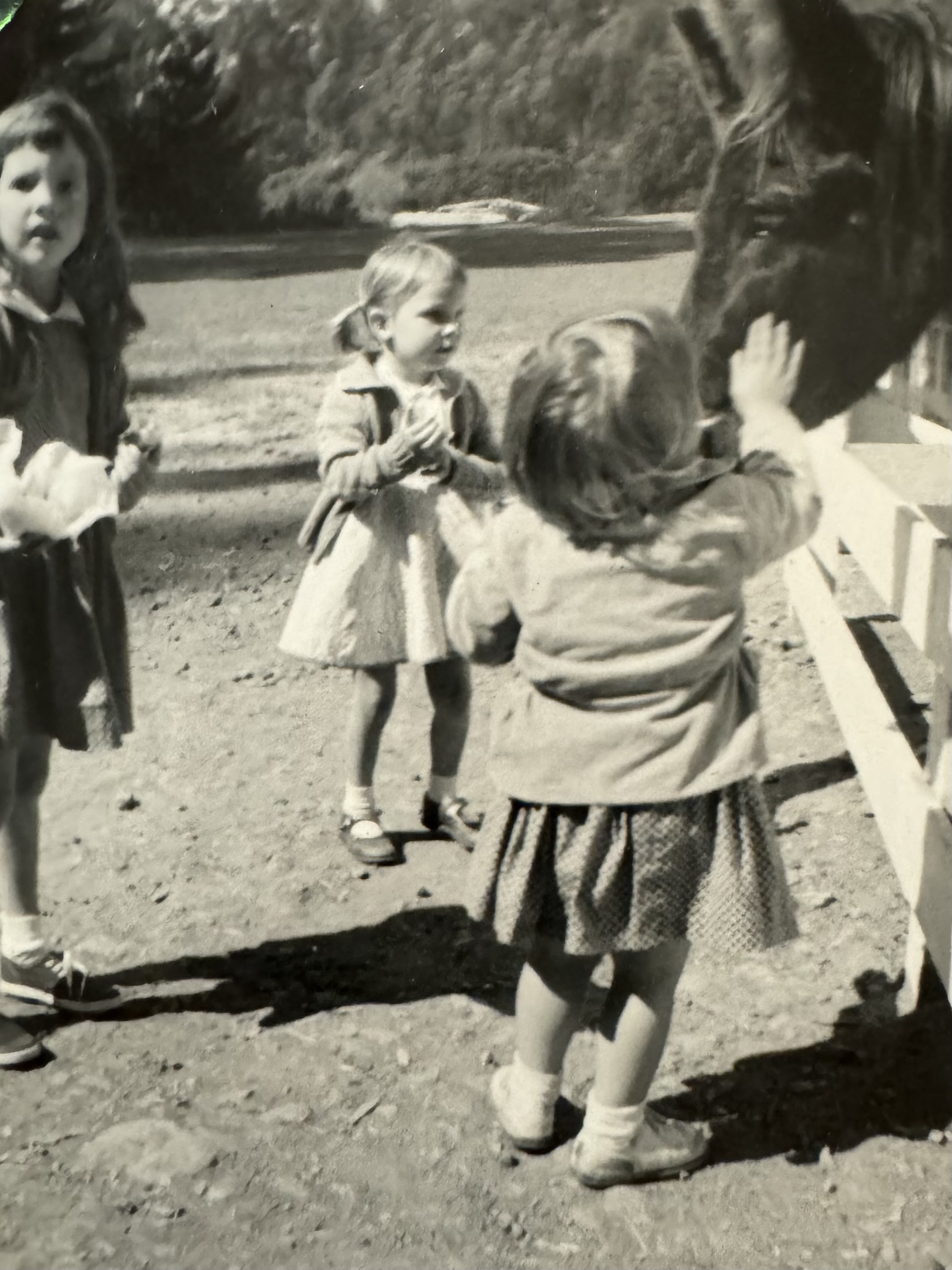I thought of horses. We’d loved the horse books, Black Beauty, My Friend Flicka. My aunt had a farm in Sacramento we visited as children; the horses were so tall, they scared me. The horses and ponies at the Children’s Farm in Tilden Park seemed more benign, gentle. And then, much later, at my father’s farm, Poco (tall and dark red) and Blackie (small, black of course, unpredictable) lived for a time. We visited them in the barn and the fields, our pockets filled with apples.