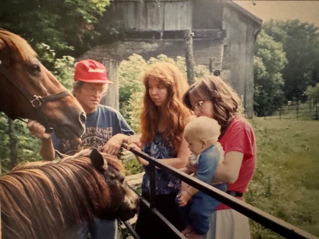 Poco, my dad, Brownie, my sister Kathryn, my son Nathaniel, and me: summer of 1995 at the farm