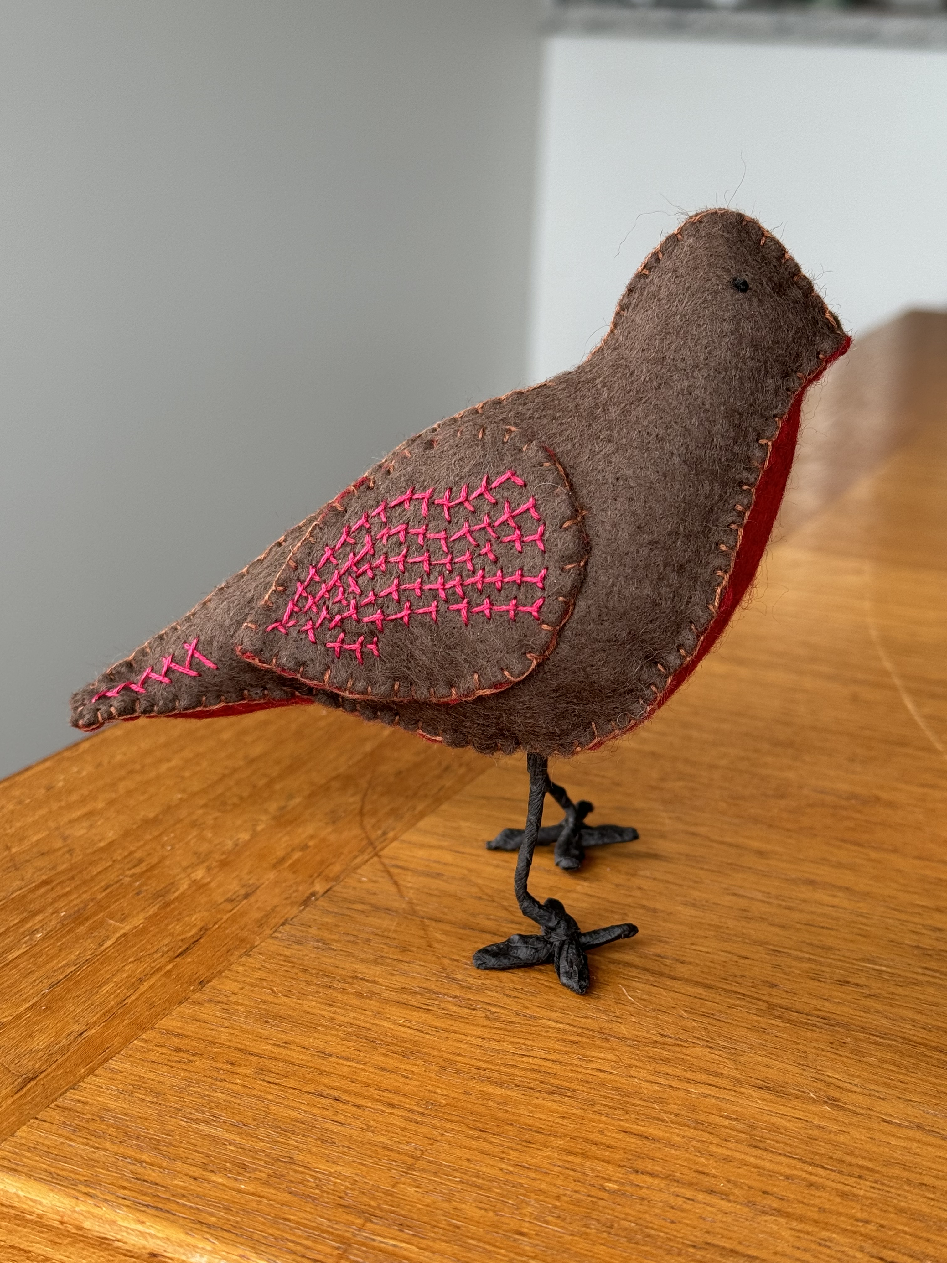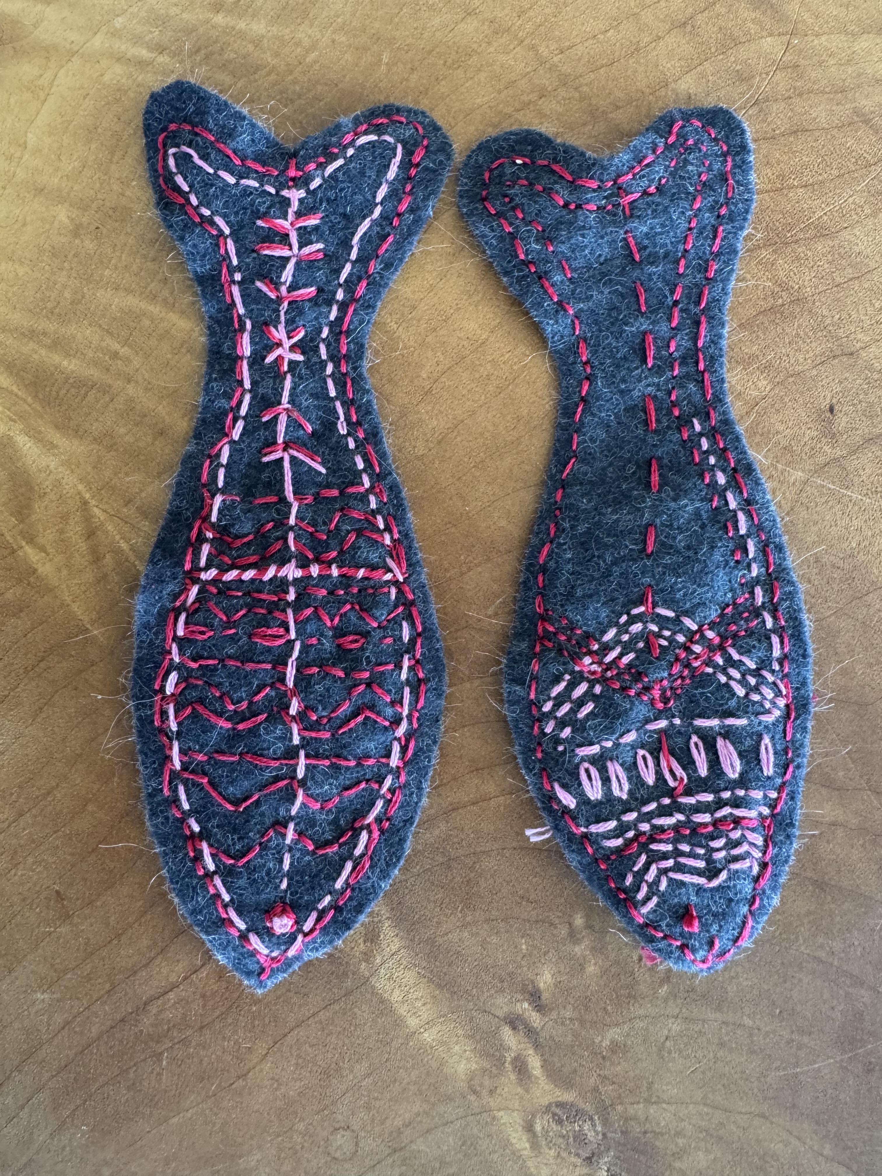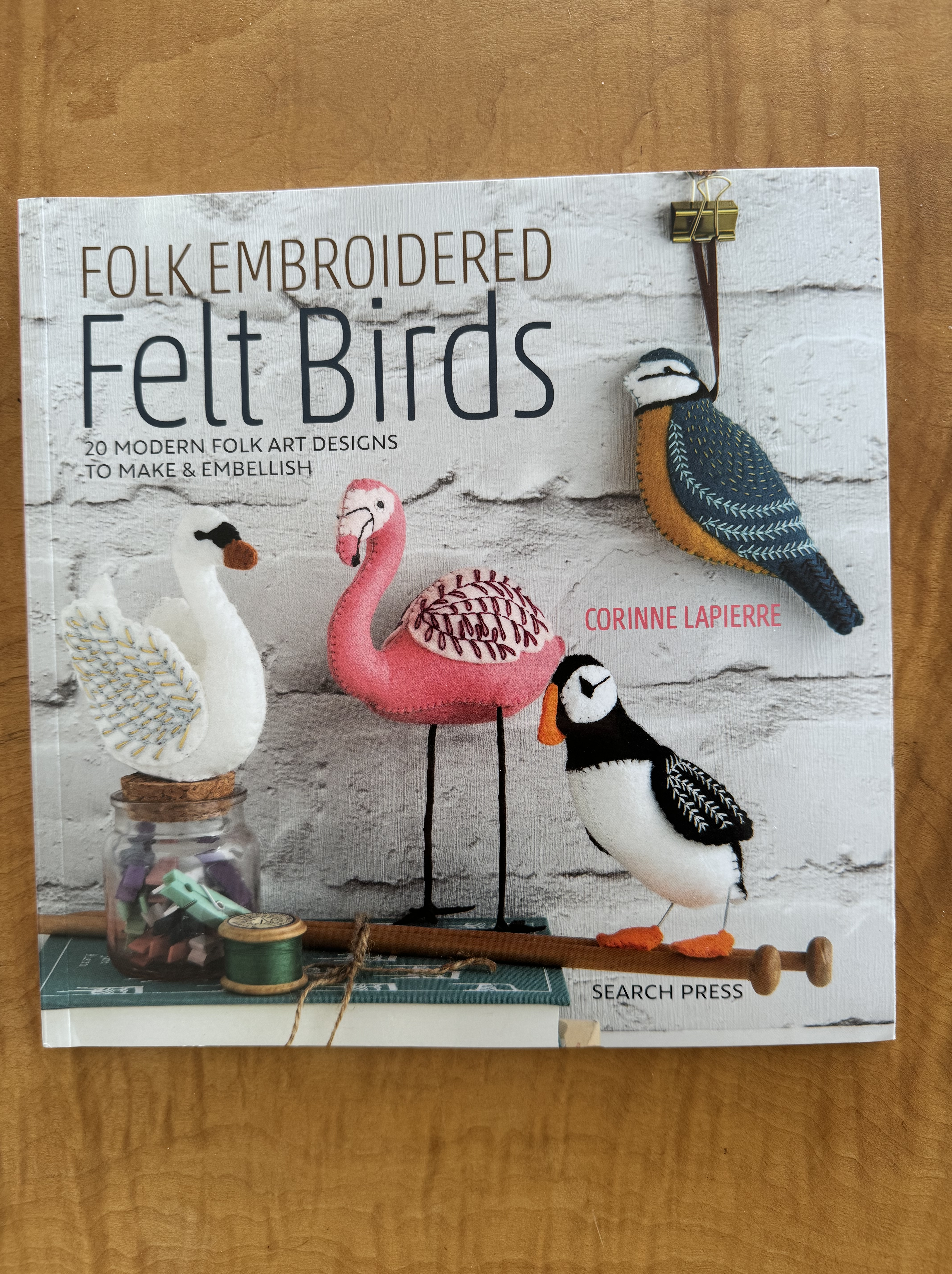 Folk Embroidered Felt Birds: 20 Modern Folk Art Designs to Make & Embellish by Corinne Lapierre. I took this book out of the library and promised myself I’d make two birds before it was due back. I like embroidering at the end of the day, after my mind has been busy with thinking, editing, word stuff. Nice to just sew coloured thread in pretty designs. I met my modest goal—I made a wonky robin and a not-bad pigeon. Then I got a notice the book was due and couldn’t be renewed, as somebody else wanted it. I made a heart for a friend’s birthday, then another heart with a favourite quotation on it, “still, flowing water” from Ajhan Chah, which is to remind me of the paradox that mind is both still and flowing. I don’t entirely understand his talk on this topic, but I still find it inspirational. Then I took out another book by Lapierre, Fabulous Felt, and I made some fish. But I realized what I really want to do is to make all of those twenty birds from her felt birds book, so eighteen more. And it seems that everybody wants the library book, so I ordered a copy and it arrived today. Lots of birds to come!