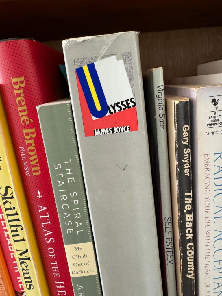 In our new house, we have a bookshelf at the top of the stairs, so every time I ascend to the main living space, a patchwork of book spines meets me like an old friend. The elongated blue U on the thick spine of James Joyce’s Ulysses always catches my eye. My mind likes to repeat itself, going back to well-trod memories, and so I return over and over—with nostalgia—to the summer in grad school when I studied that great modernist novel. It was an intense, six-week seminar course. A small, intimate group of students, mostly women, met for three hours, twice weekly. Each student had to present several times on chosen topics. I was working hard. Add to my hard work and yearning for an A, the presence of a provocative, flirtatious professor who created a highly charged atmosphere in the hot seminar room.