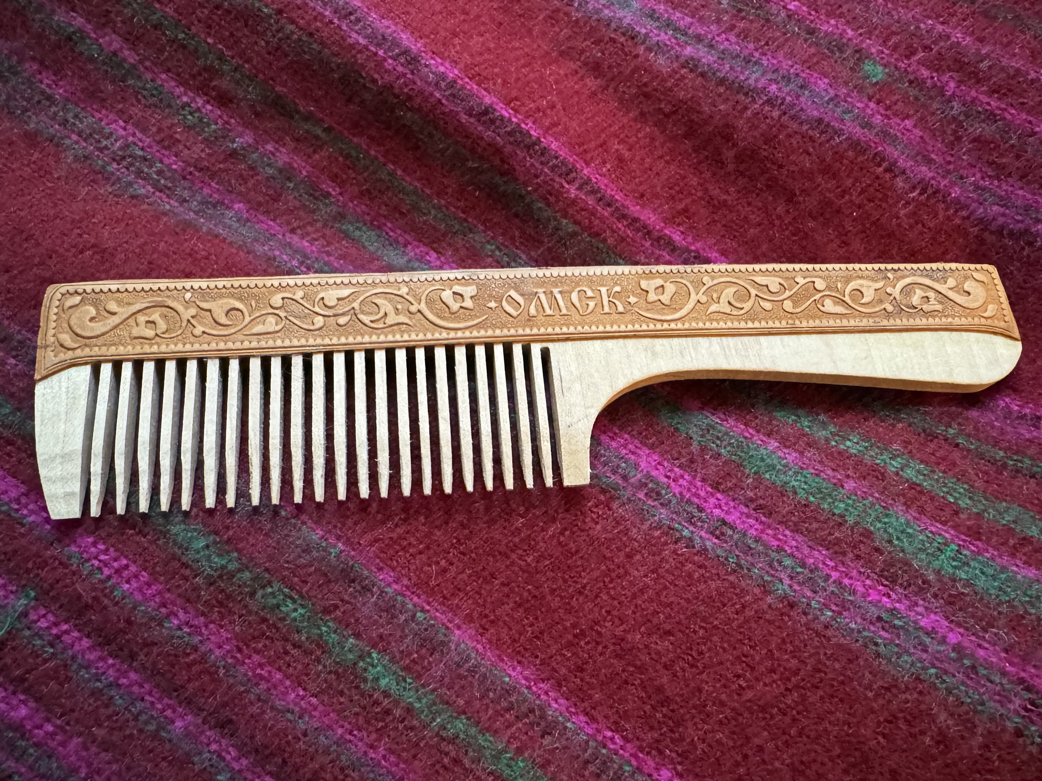 The comb is the foremost untangler, a simple yet effective tool. The earliest known comb was discovered in Syria and dates from 8,000 BC. Made from animal bone, it looks much like the combs we use now, with a handle and teeth. You can buy a cheap black plastic comb in any drugstore, but I am thinking of a more elegant object: the carved wooden comb my friend Olga gave to me. She brought it back from Omsk, Russia, her hometown. I keep that comb at my desk to remind me of her, but lately, I have been using it to comb my hair. To comb is to untangle, to straighten.